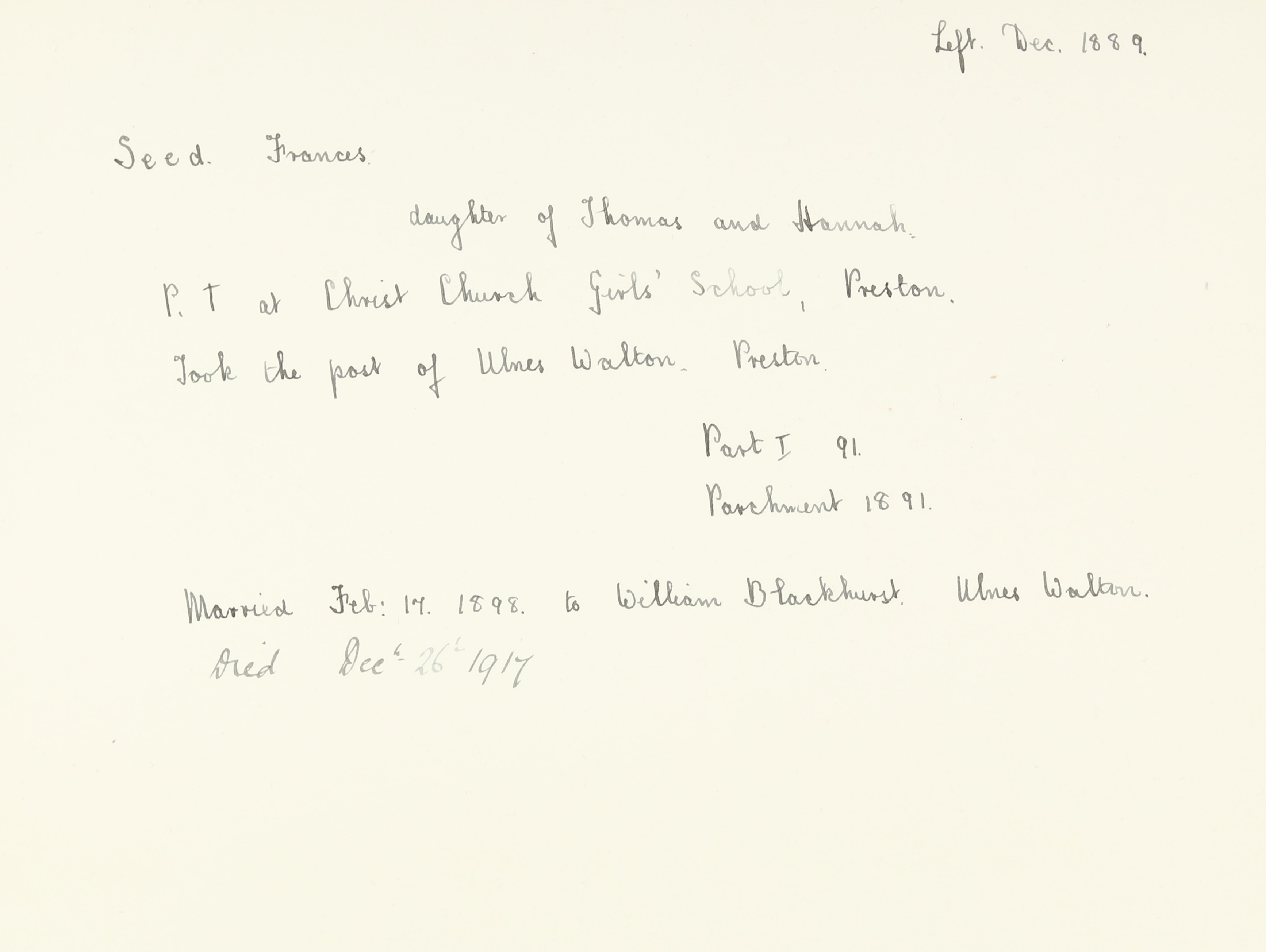 She is at Ulnes Walton Lane, Chorley. Frances is listed as ‘Schoolmistress’. Her brother, Thomas, is listed as ‘Pupil Teacher’.