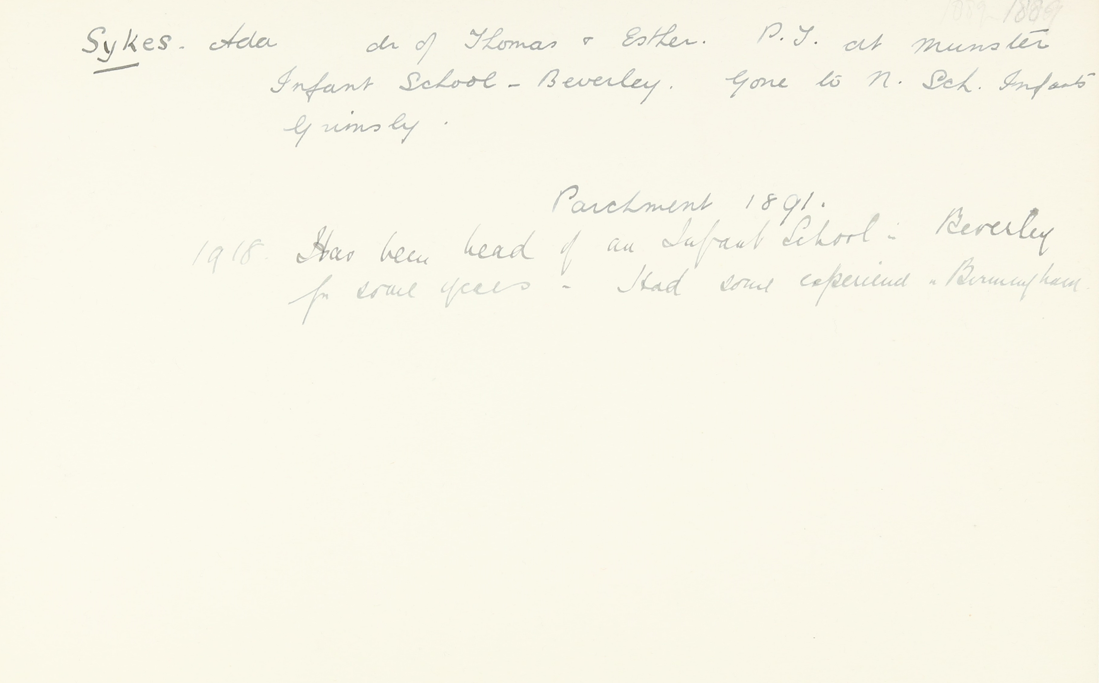 She is at Wood Lane, Beverley. Her father is listed as widower and ‘Builder’. Her sister, Mary, is listed as ‘Housekeeper’. Ada is listed as ‘Mistress at Elementary School’. Her sister, Agnes, is listed as ‘Dressmaker’. Annie J Sharp (b. 1872), a visitor, is listed as ‘Living on own means’.