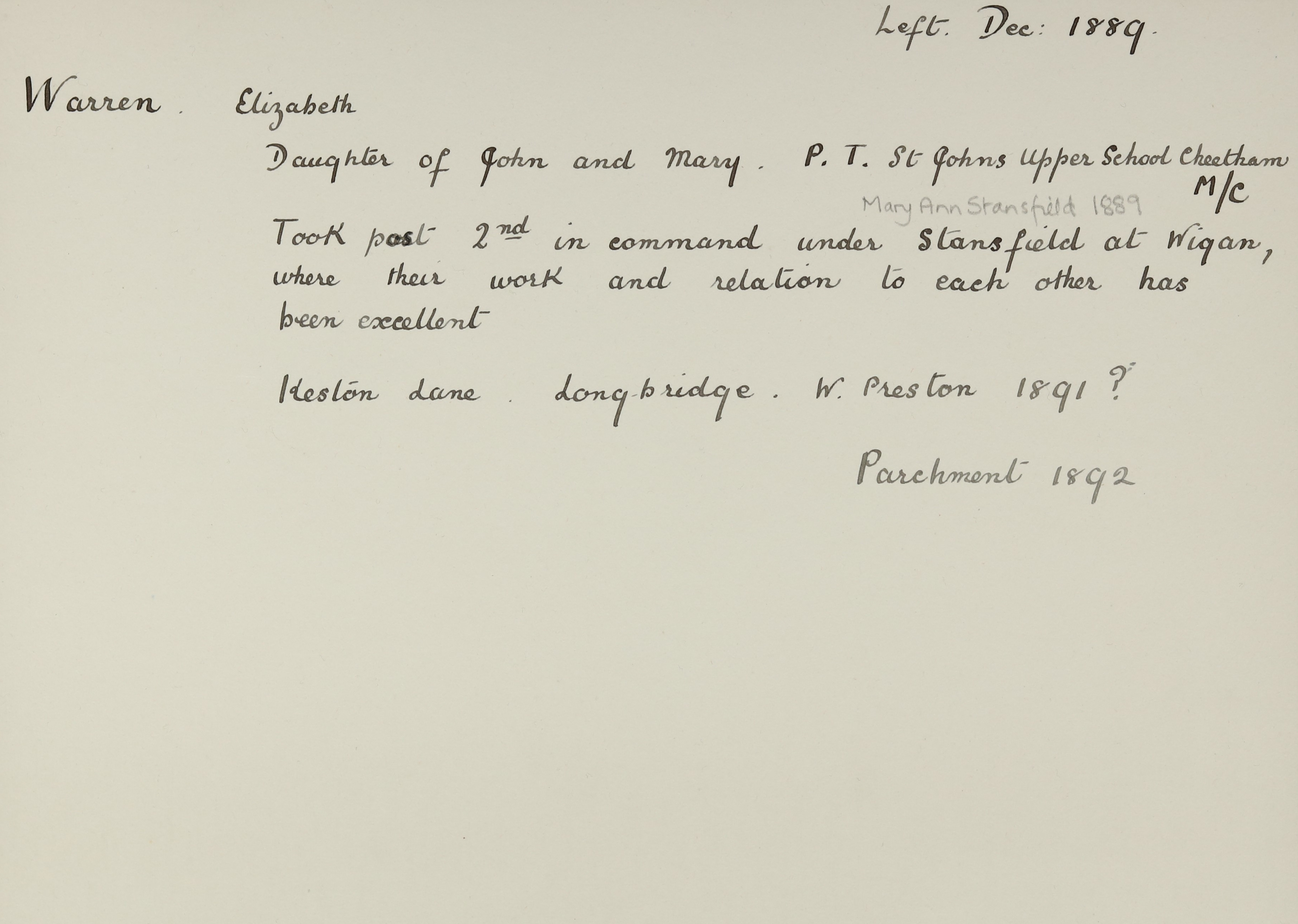 She is at Waterloo Road, Cheetham. Her father is listed as ‘General Clerk’. Her uncle, Henry Warren (b. 1830), is listed as ‘Hatter Foreman’. Elizabeth, her mother and sister, Mary, are unlisted. There is a servant, Bridget McDonnell.