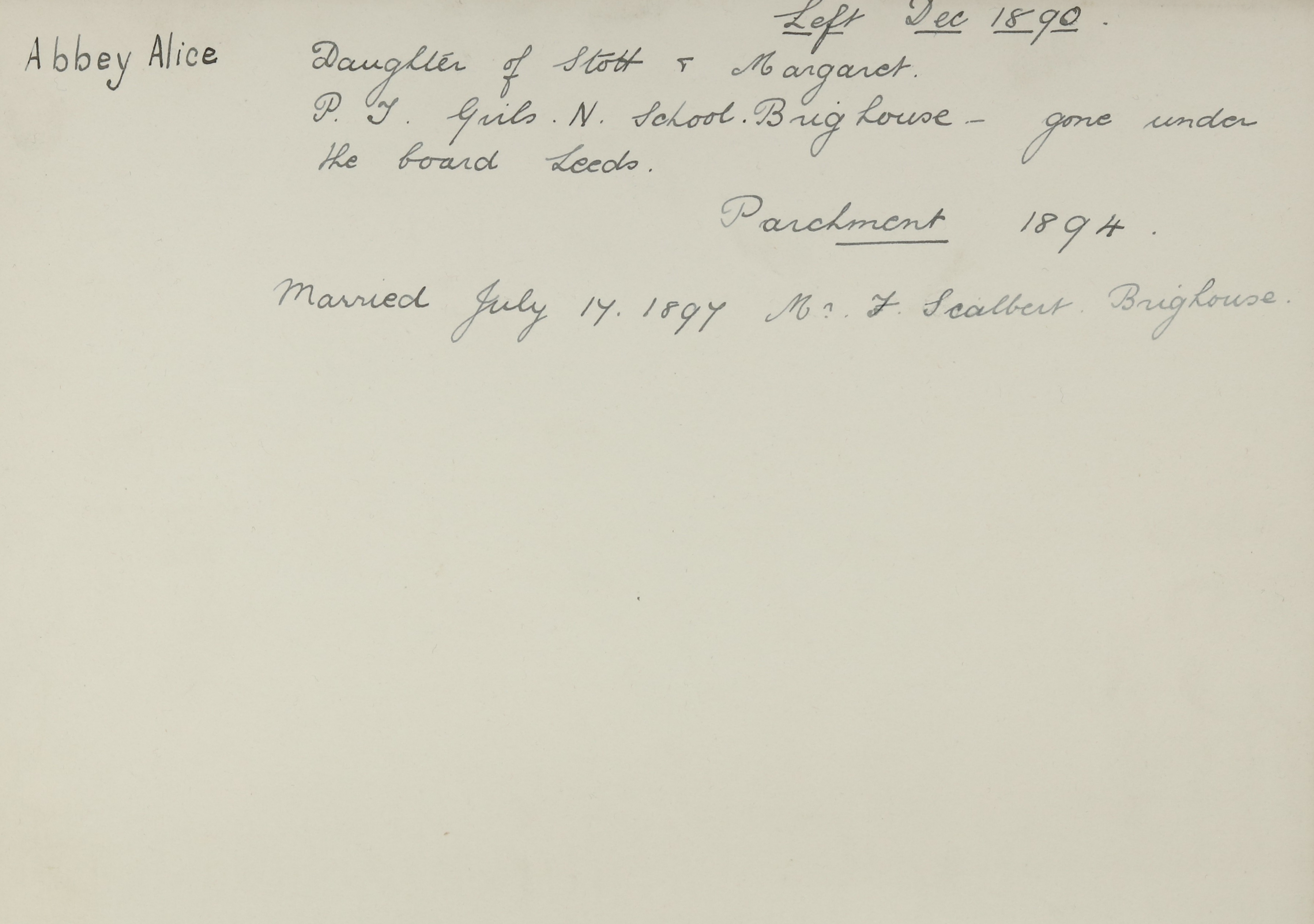 She is at 12 King Street, Hipperholme with Brighouse. Her father is listed as ‘Manager Co-Operative Provisions Store’. Alice and her mother are unlisted. Her sister, Hannah, is listed as ‘Draper Saleswoman’. Her sister, Mary, is listed as ‘House Keeper’. Her sister, Sarah, is listed as ‘Dressmaker’.