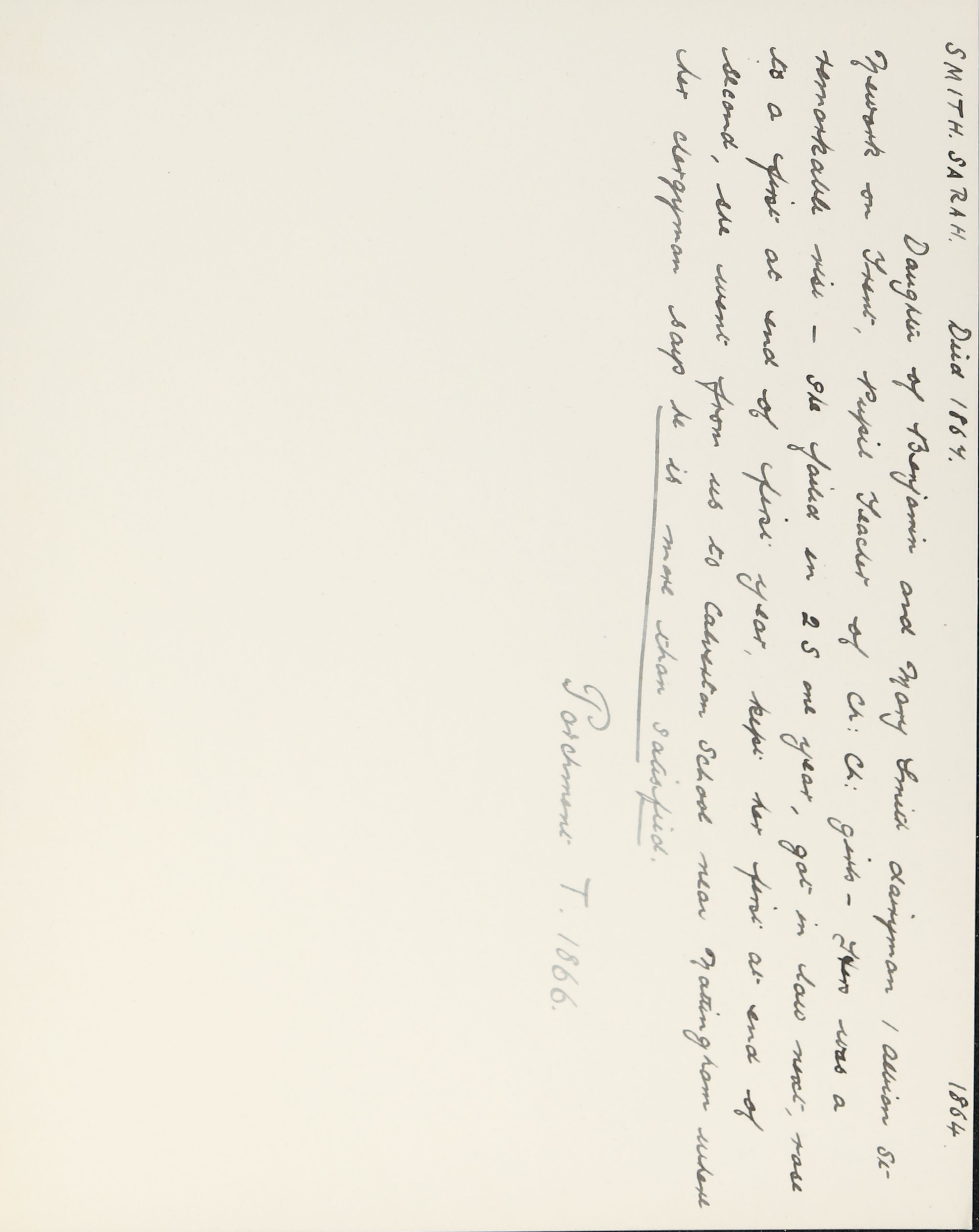 She is at 1 Albion Street, Newark. Her father is listed as ‘Cow Keeper’. Her sister, Ellen, is listed as ‘Milliner’. Her sister, Rebecca, is listed as ‘Dressmaker’. Her sister, Jane, is listed as ‘Cow Keeper Assistant’. Her cousin, William Smith (b. 1841), is listed as ‘Joiner Apprentice’. Her mother is unlisted. Sarah is listed as ‘Pupil Teacher’.