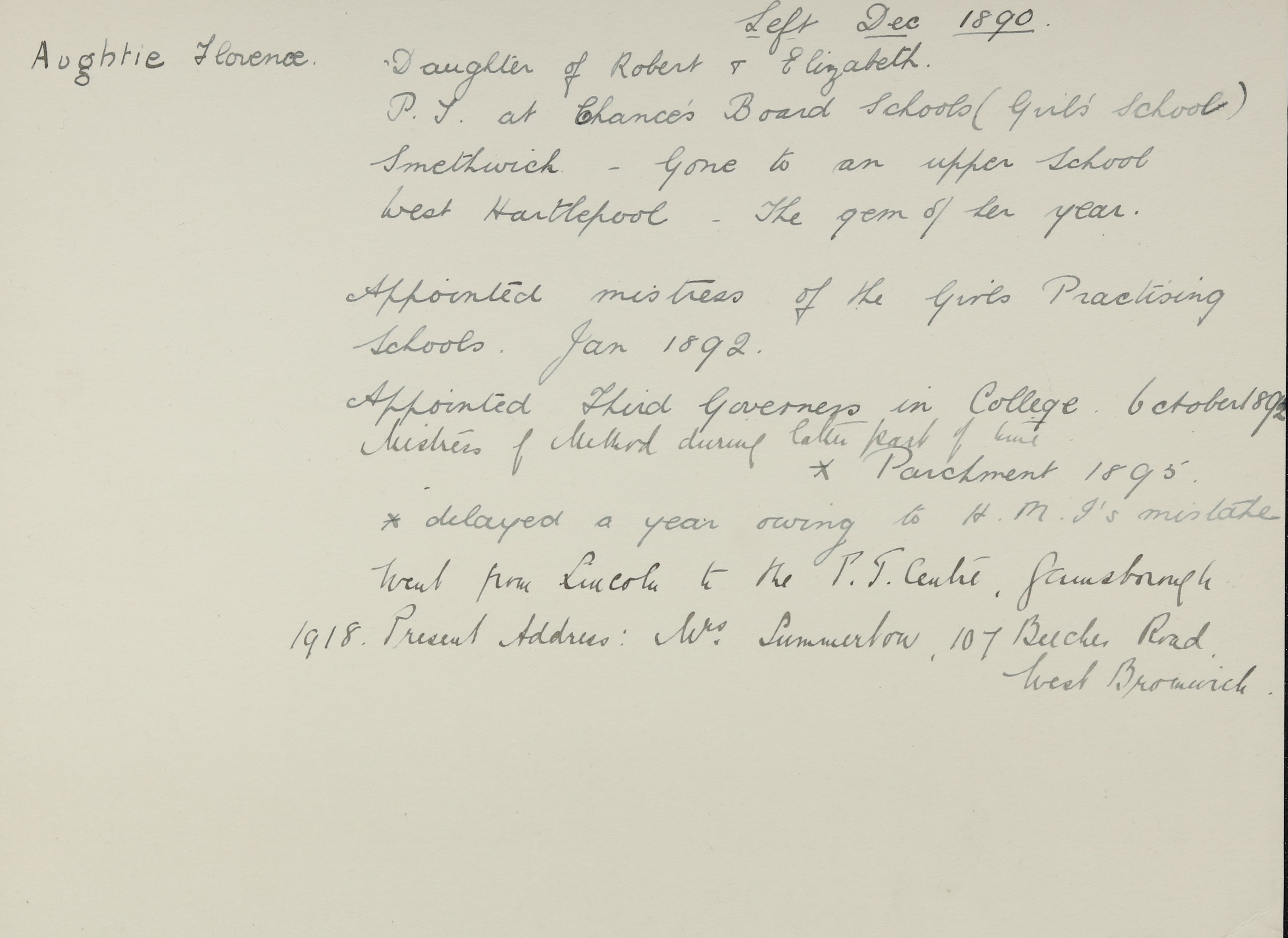 She is at 27 Cobden Street, Wollaston, Worcestershire. Florence is listed as ‘Mistress of Method at Training College’. Her sister, Ada, is listed as ‘Public Elementary Schoolmistress’. Her mother is an unlisted widow.