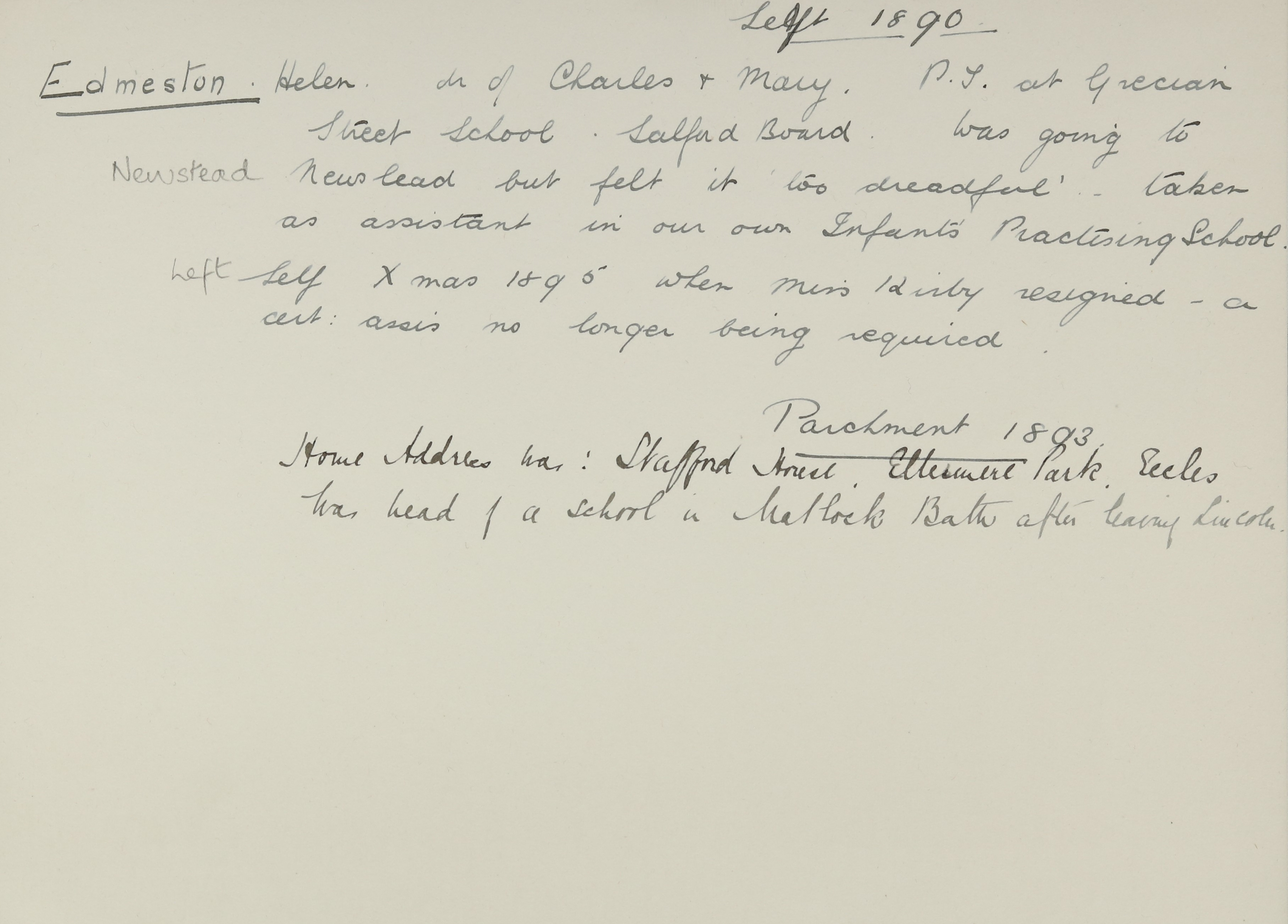 She is at Eglemont Terrace, Broughton, Salford. Her grandfather, Archibald Edmeston (b. 1808), is listed as ‘Machine Maker’. Her grandmother, Hannah Edmeston (b. 1812), is unlisted. Her aunt, Mary Edmeston (b. 1838), is listed as ‘Teacher of Music’.Her father is listed as ‘Manager to Machine Maker’. Helen and her mother are unlisted. Her uncle, Alfred Edmeston (b. 1852), is listed as ‘Apprentice to Machine Maker’. Her aunt, Helen Edmeston (b. 1853), is listed as ‘Teacher of Music and Drawing’. There is a servant, Ellen Prince (b. 1845).