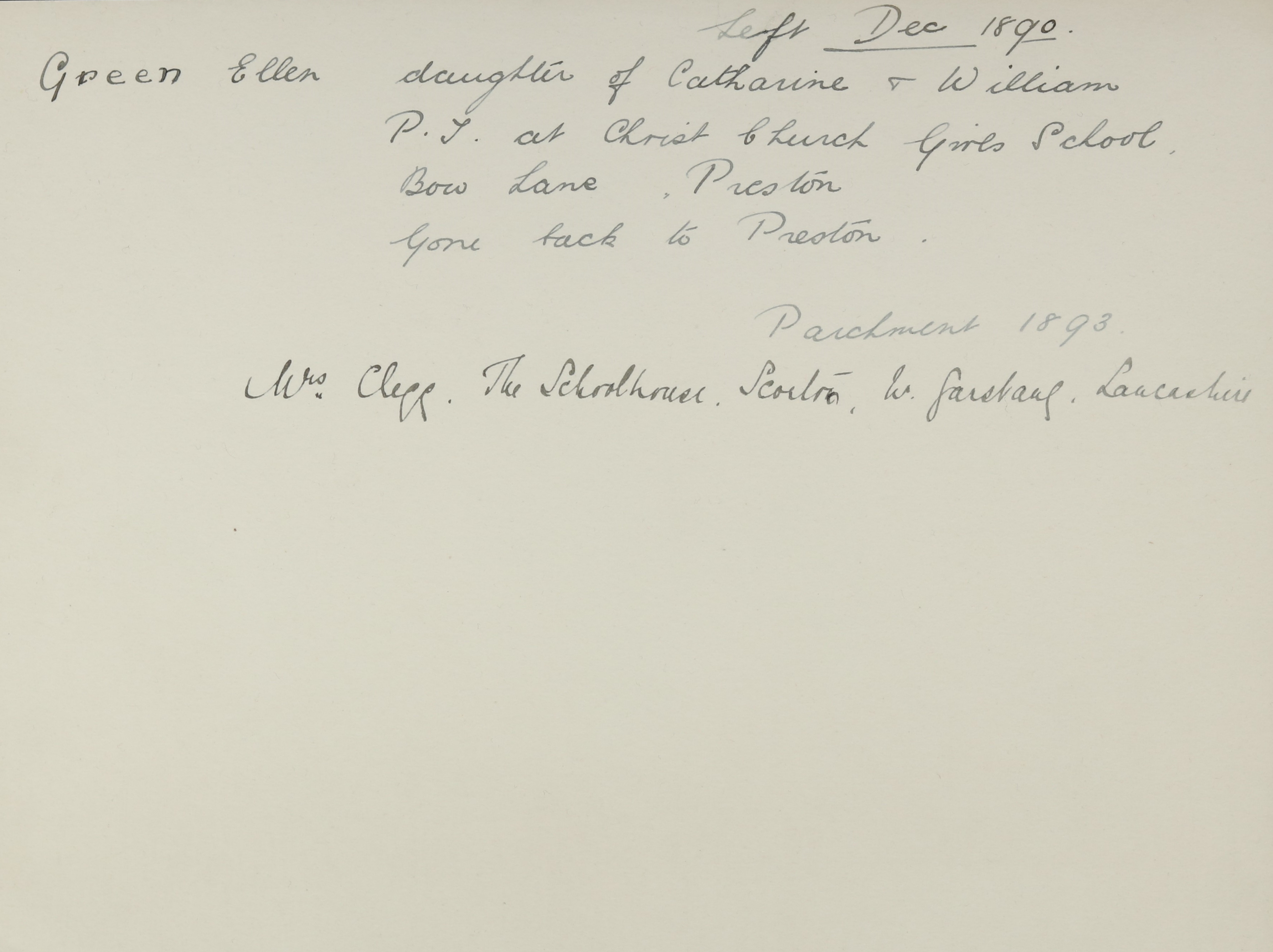 She is at Christ Church Terrace, Preston. Her great aunt, Elizabeth Bibby (b. 1820), is listed as widow and ‘Living on own Means’. Ellen is listed as ‘Head Teacher in National School’.