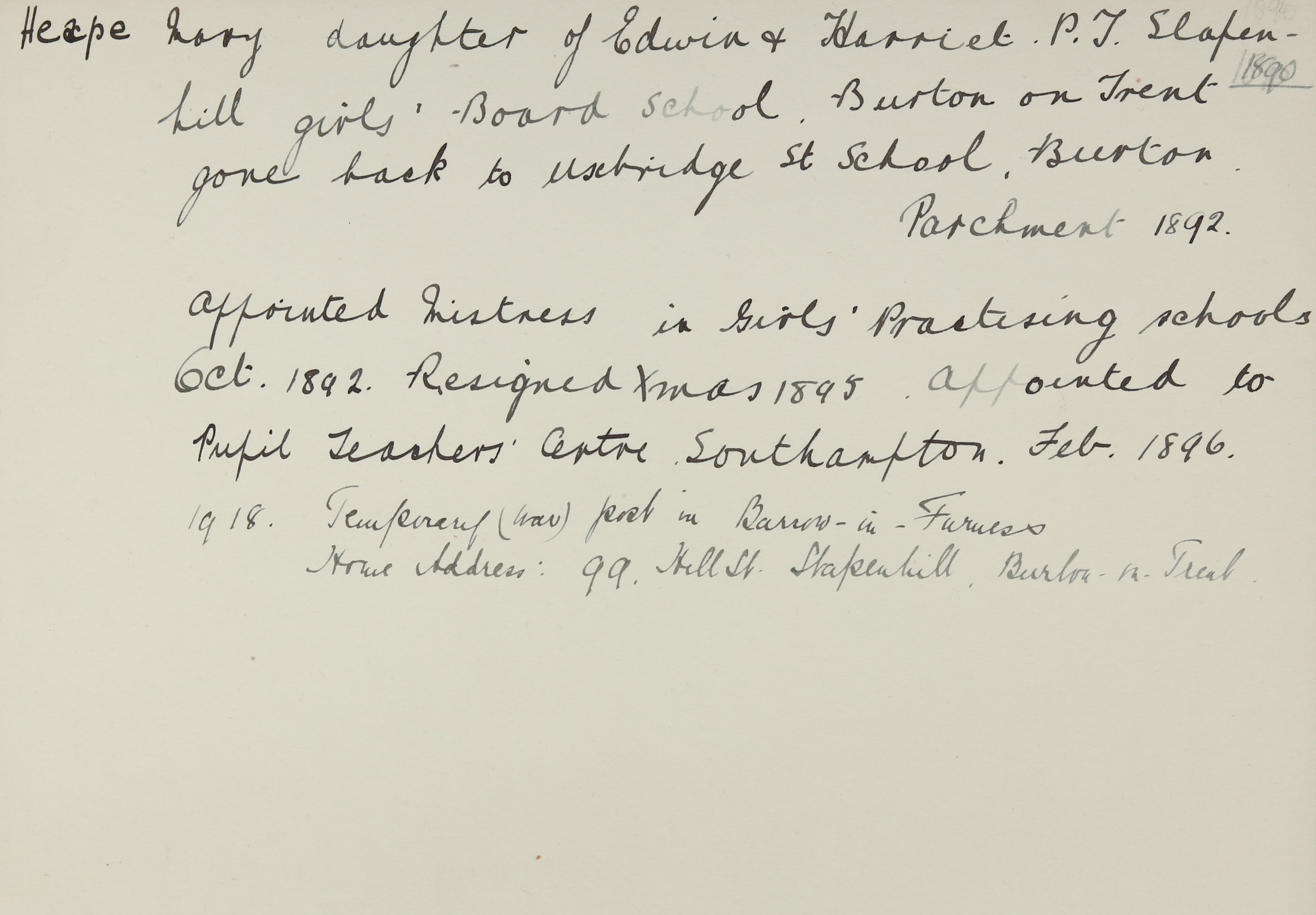 Appointed to Pupil Teacher's Centre, Southampton.