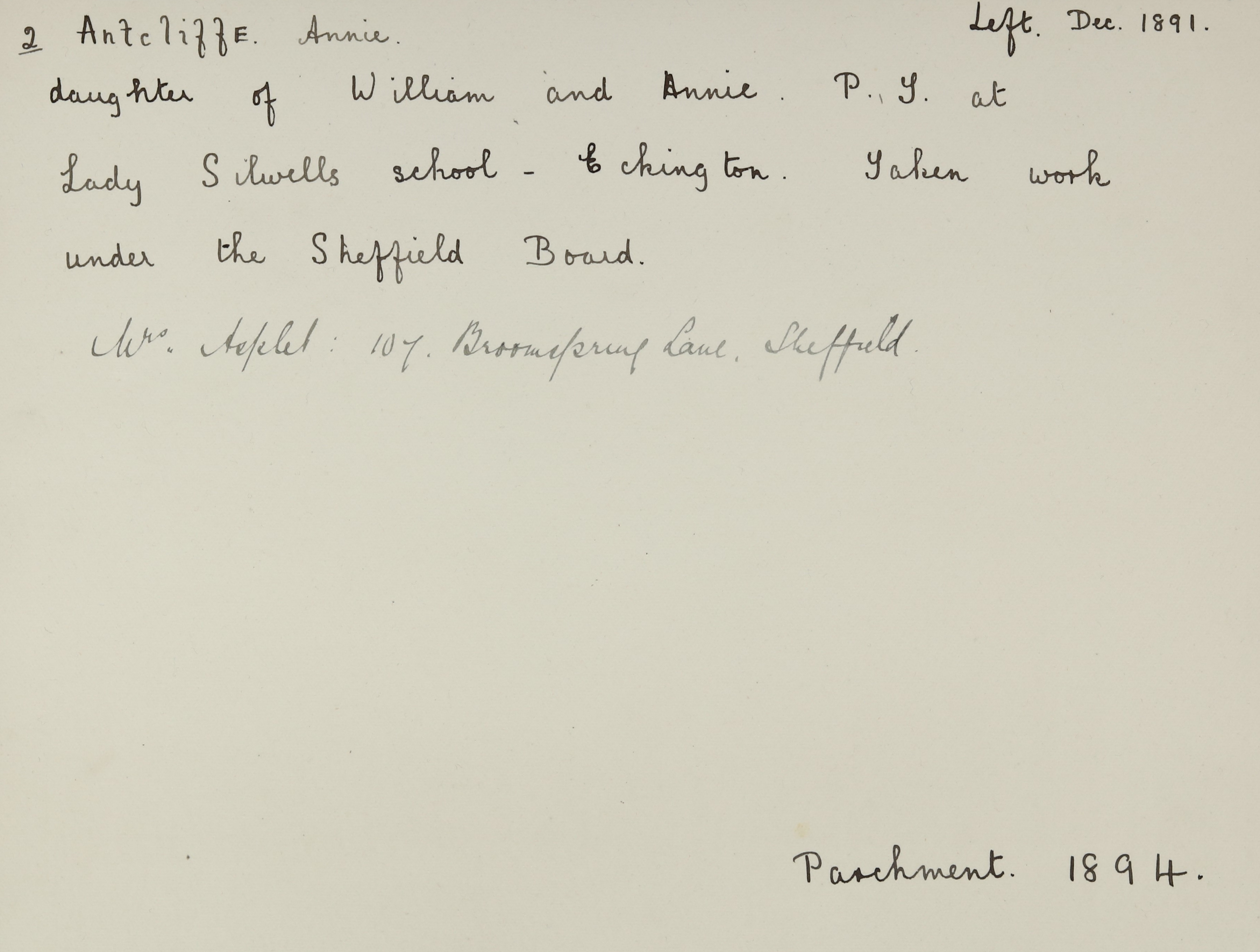 She is at Angel Street, Angel Yard, Eckington, Chesterfield. Her father is listed as ‘Millwright’. Her mother is listed as ‘Dressmaker’. Annie and her sisters, Lilian and Elizabeth, are unlisted.