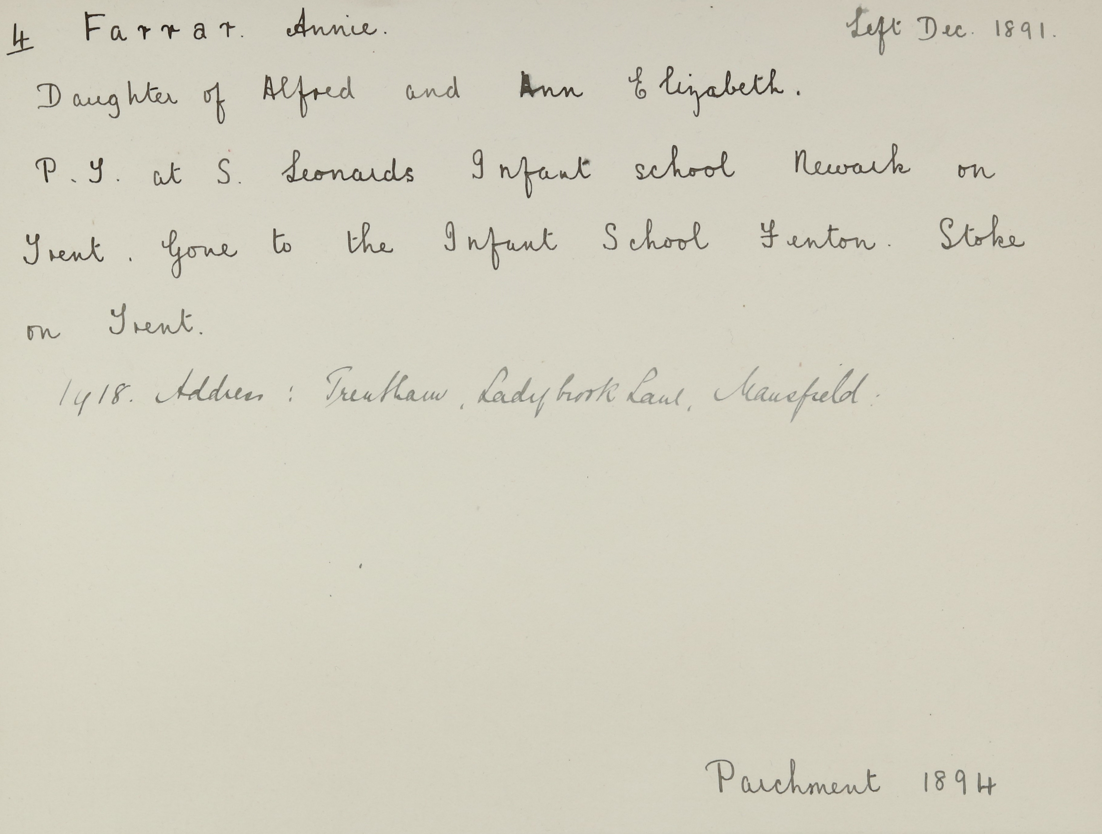 She is at Parada, Newark. Her father is listed as ‘Draughtsman at Engine and Boiler Makers’. Annie, her mother and her aunt, Mary Farrar (b. 1841), are unlisted.