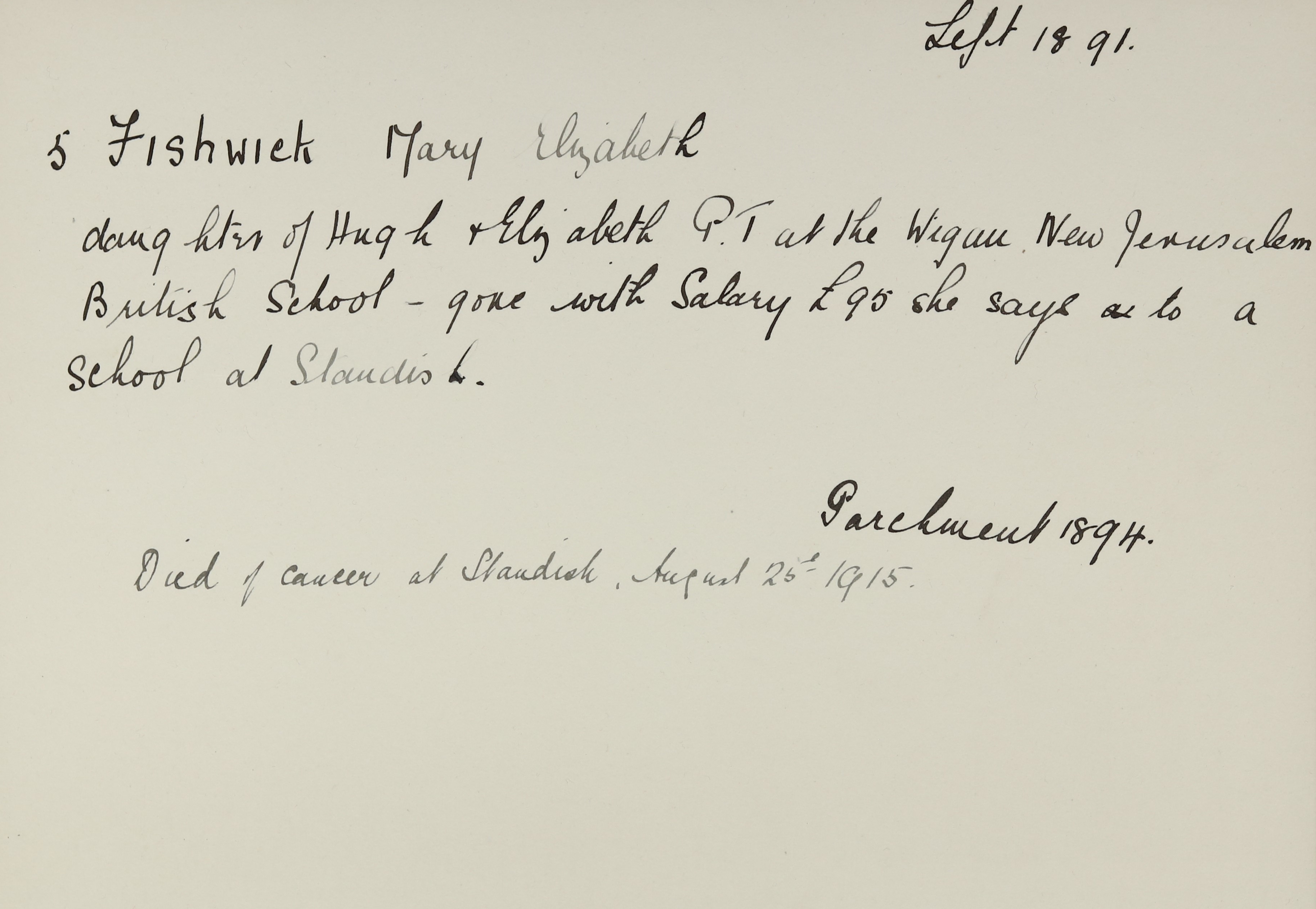 FISHWICK, Mary Elizabeth of Beckside, Standish, Lancashire, spinster died 25 August 1915. Probate Lancaster 28 September to Mary Elizabeth Parker, spinster. Effects £1518, 14s, 4d.