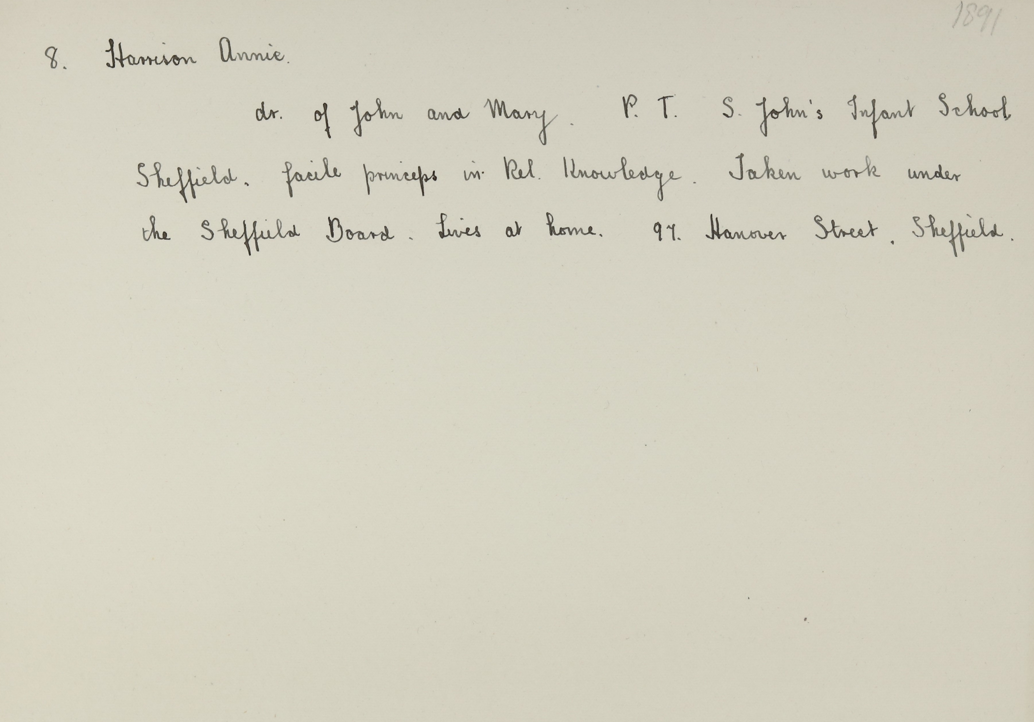 She is at Hanover Street, Sheffield. Her mother is an unlisted widow. Her sisters (Ellen, Margaret and Elizabeth) are listed as ‘Assistant Schoolmistress’. Annie is listed as ‘Student in Lincoln Training College’. There is a servant, Mabel Sheldon (b. 1875).