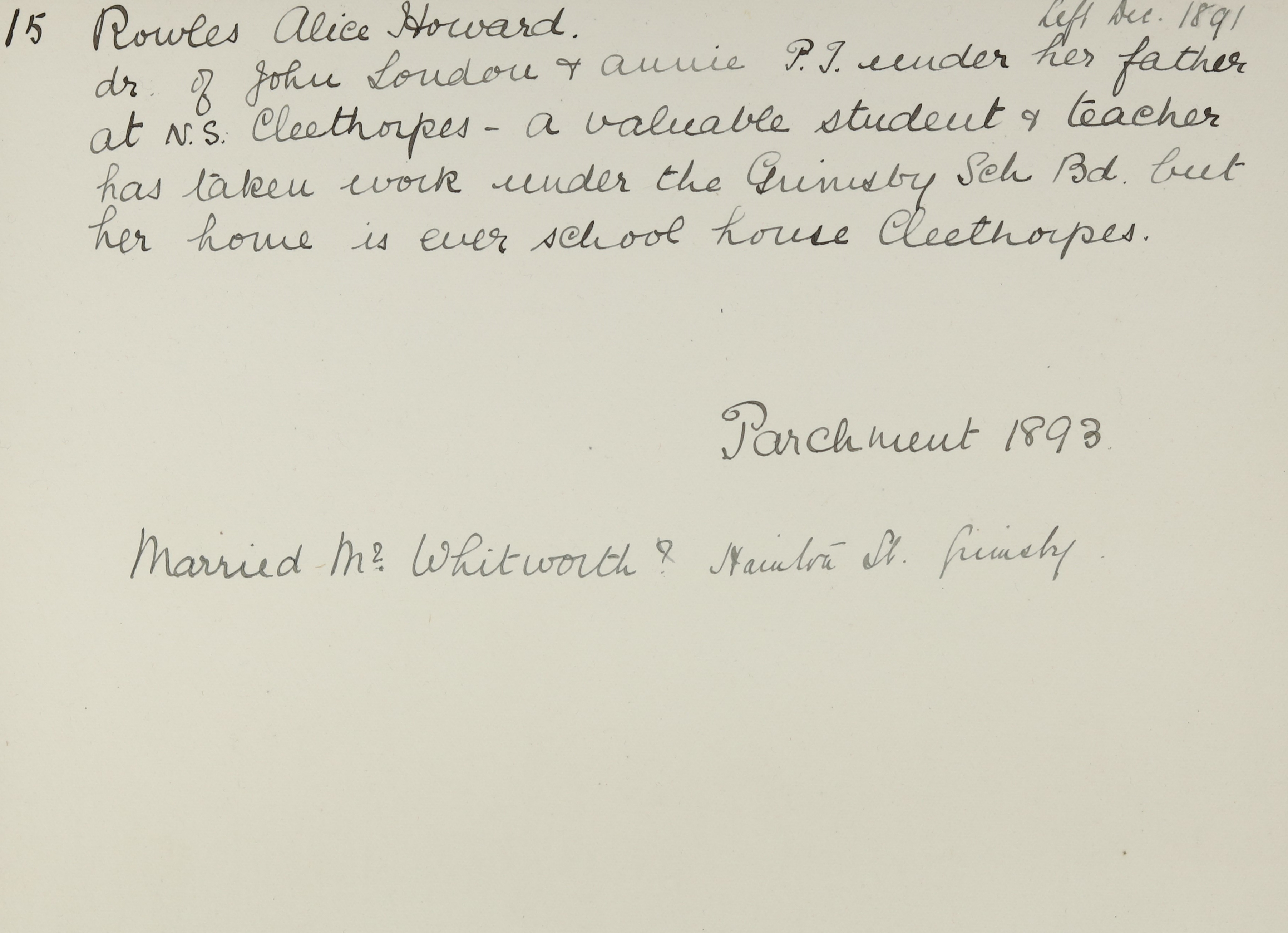 She is at Church Road, Clee. Her father is listed as ‘Schoolmaster’. Her mother is listed as ‘Schoolmistress’. Alice is unlisted.