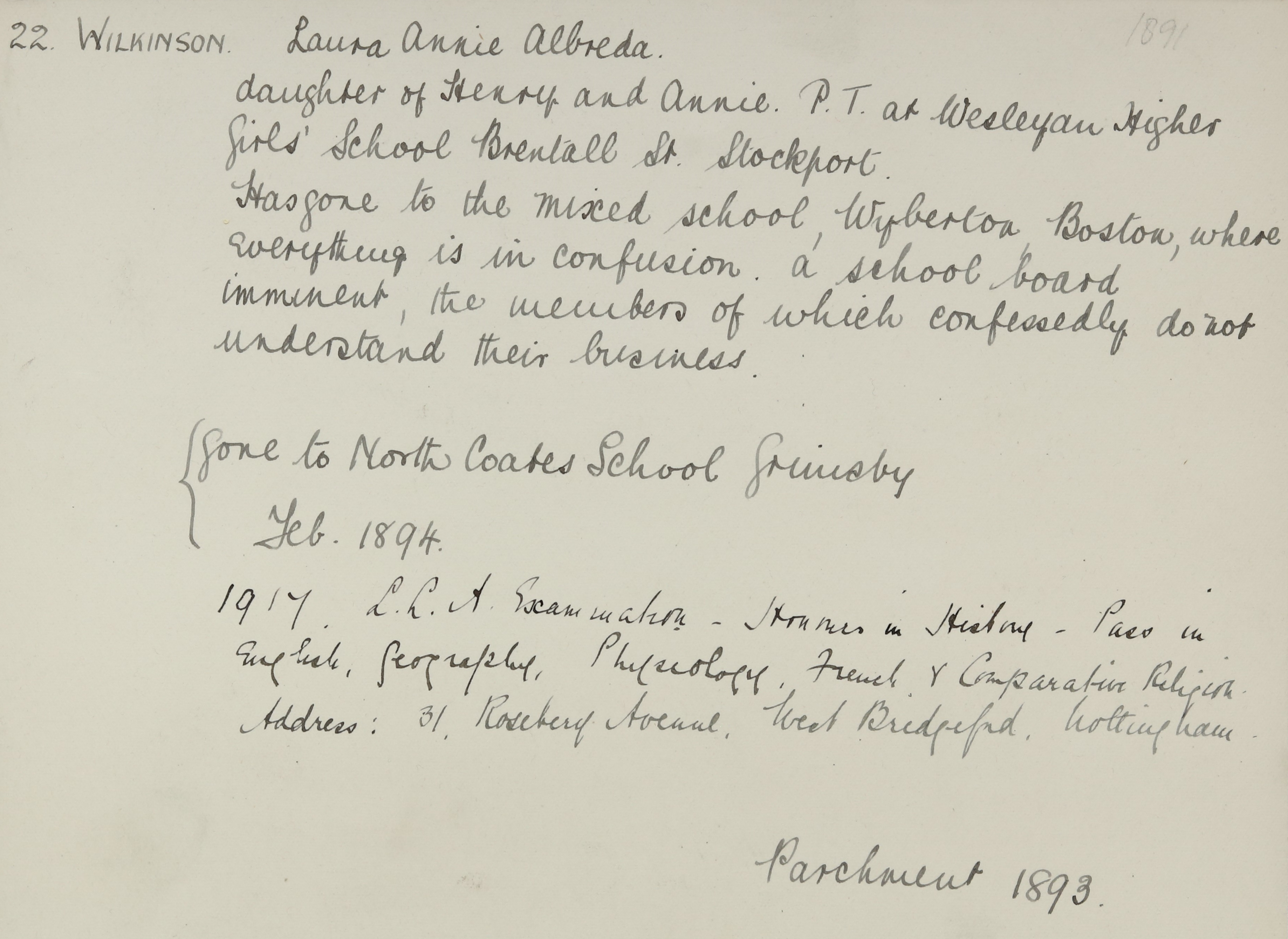 She is at Market Place, Epworth. Her father is listed as ‘Grocer and Stationer’. Laura is listed as ‘Student’. Her mother and brother, James, are unlisted.