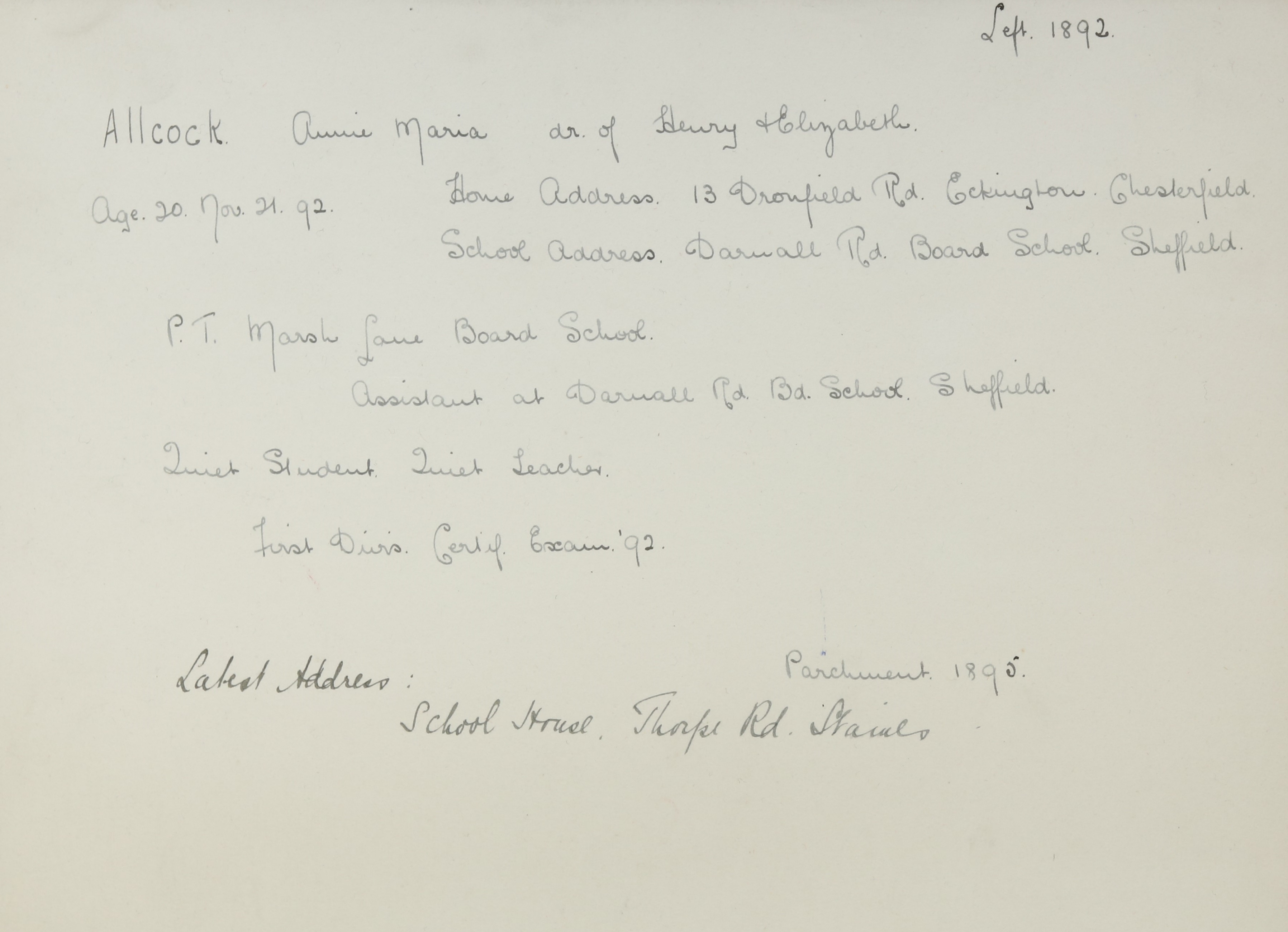 She is at Dronfield Road, Eckington. Her father is listed as ‘Coal Miners Check Weighman’. Her mother is unlisted. Annie is listed as ‘Student of Elementary Teaching’. Her sister, Sarah, is listed as ‘Dressmaker Apprentice’.