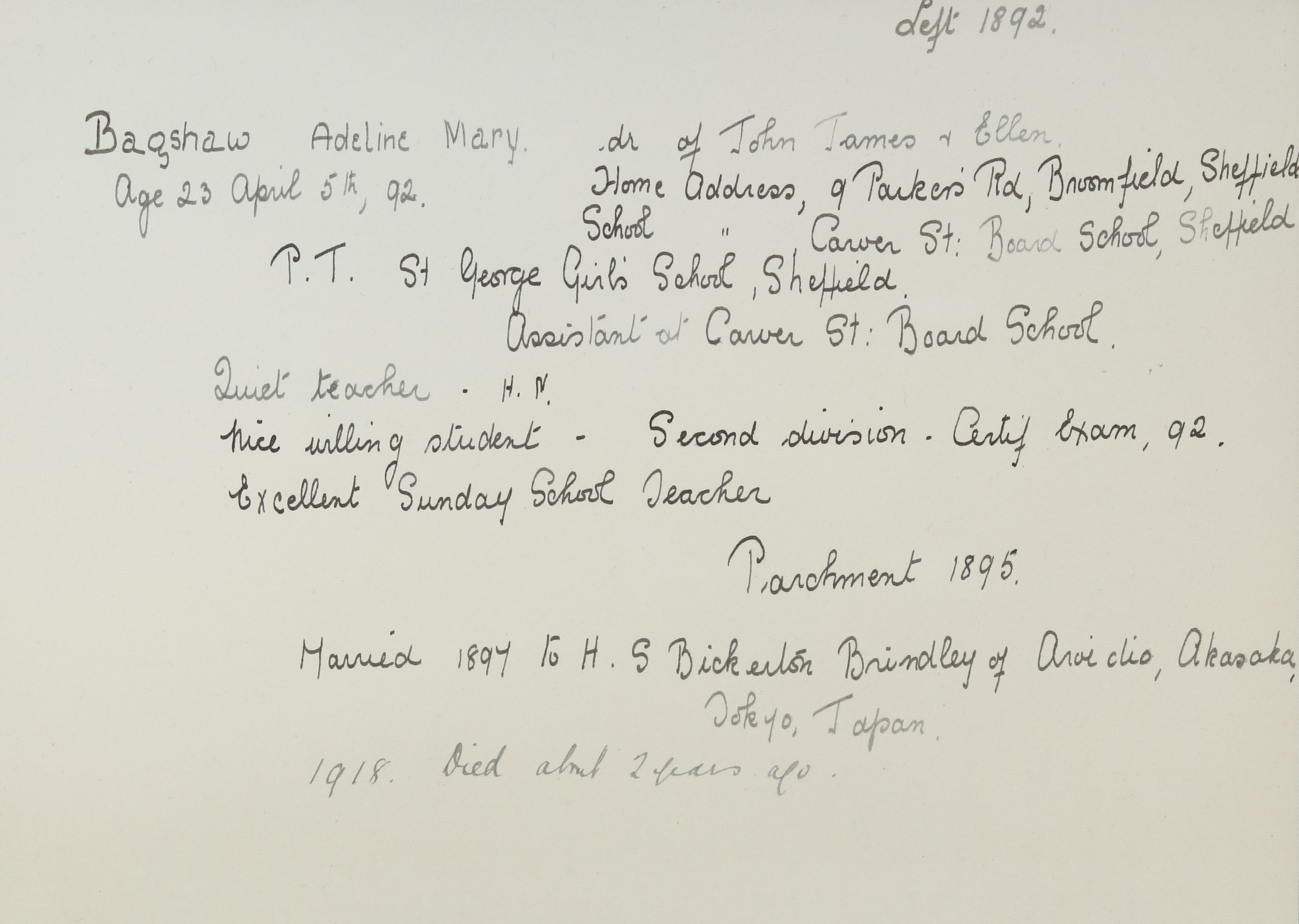 Marries H.S. Bickerton Brindley. Add: 3 Awoicho, Alssaka, Tokio, Japan.