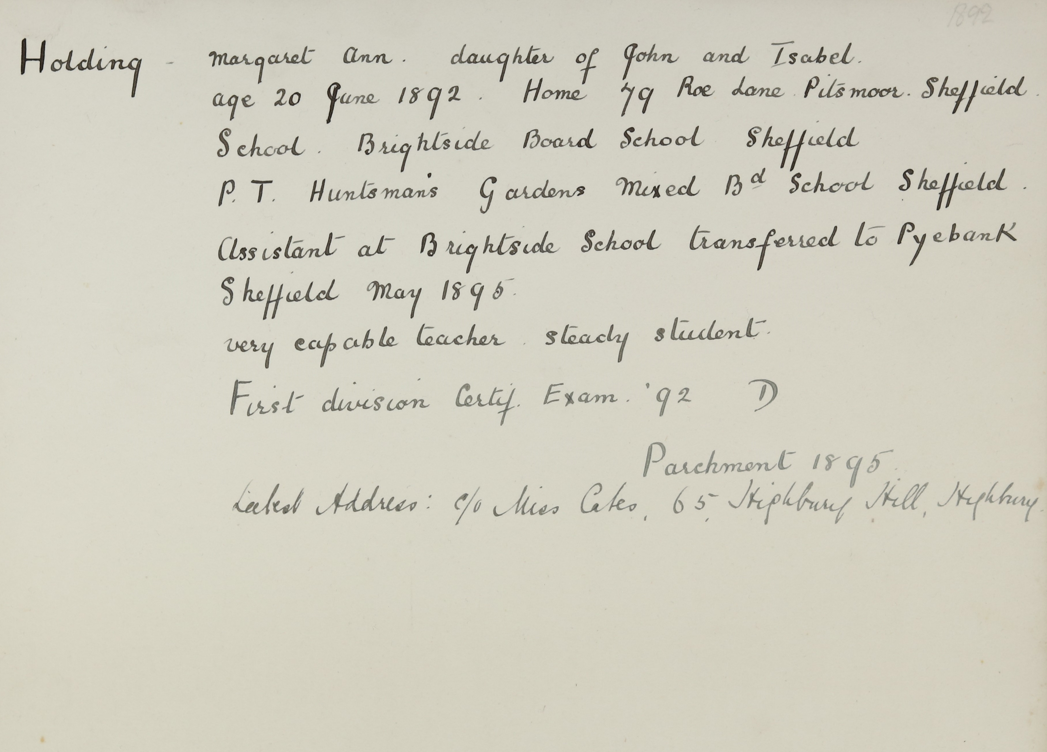 Address is c/o Miss Cates, 65 Highbury Hill, Highbury.