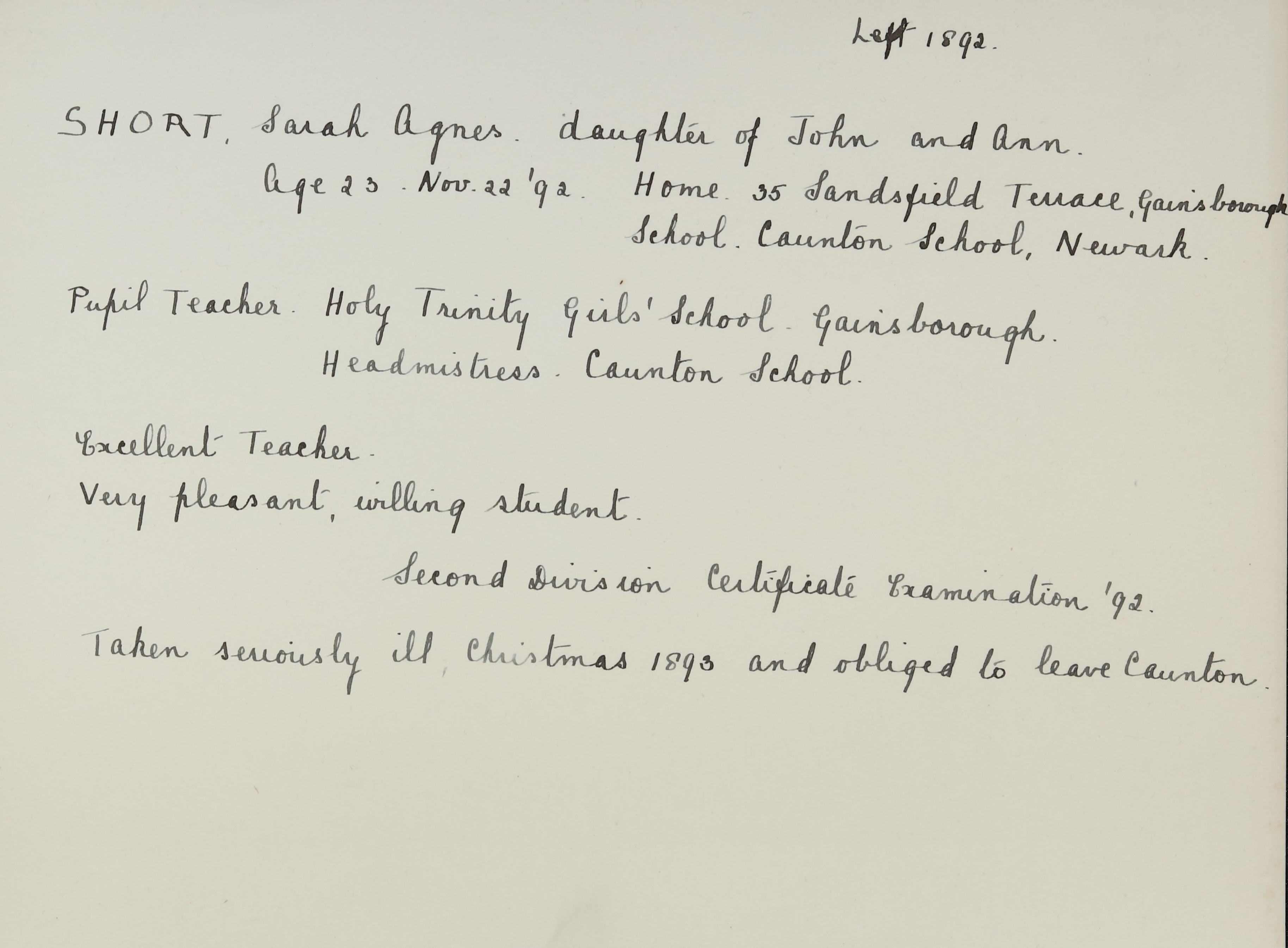 She is at Sandsfield Lane, Gainsborough. Her uncle, Frederick Gregory (b. 1832), is listed as ‘Time Clerk’. Her aunt, Frances Gregory (b. 1831), is unlisted. Her uncle, Thomas White (b. 1832), is listed as ‘Drapery Traveller’. Her uncle, George White (b. 1841), is listed as ‘Labourer in Foundry Iron Moulder’. Her sister, Edith Louisa Short (b. 1867), is listed as ‘Milliner’. Sarah is listed as ‘Elementary School Teacher’.