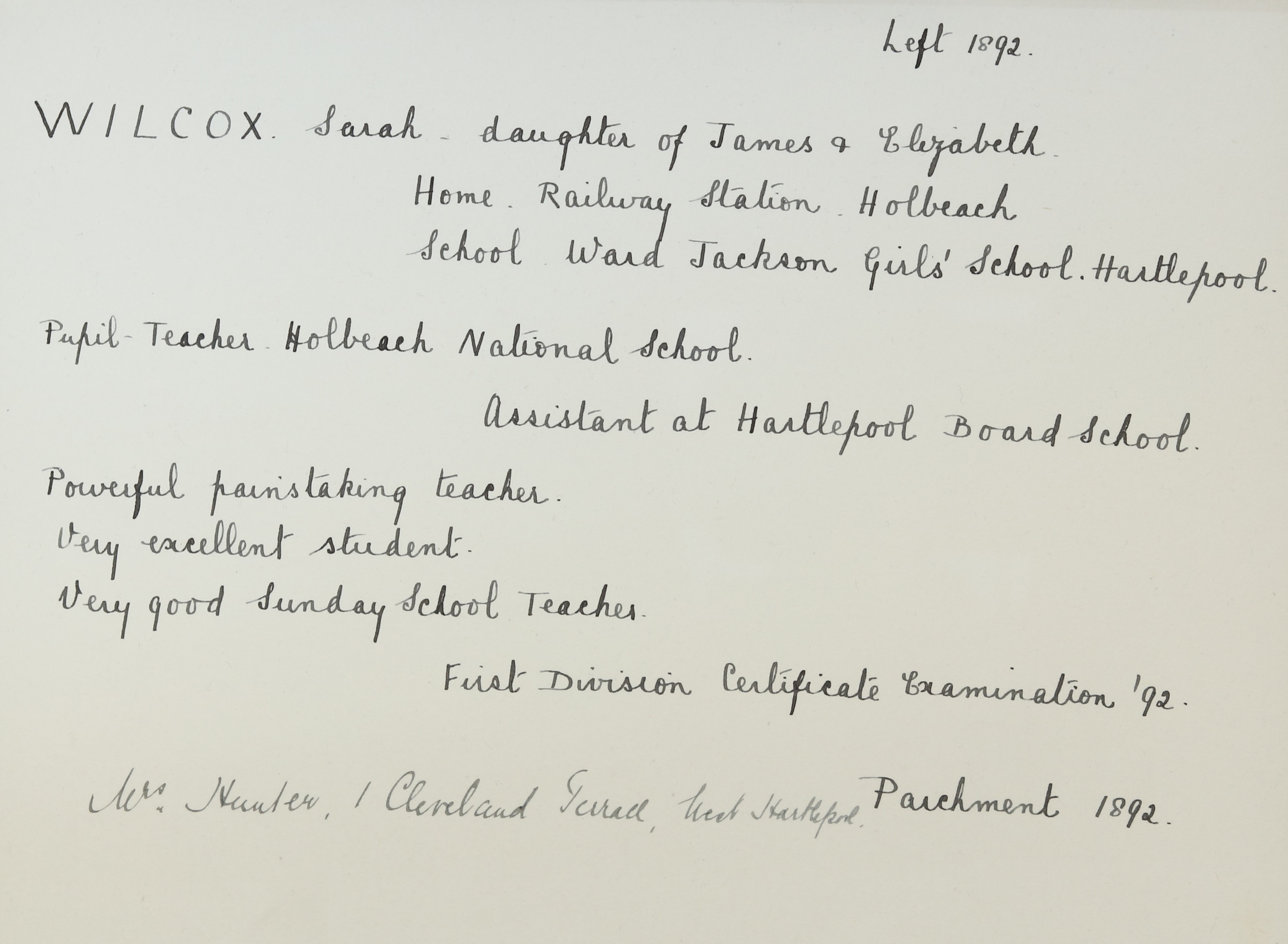 She is at Barrington Gate, Holbeach. Her father is listed as ‘Railway Station Master’. Her mother is unlisted. Sarah is listed as ‘Student Training College’. Her sister, Nellie, is listed as ‘Pupil Teacher’.
