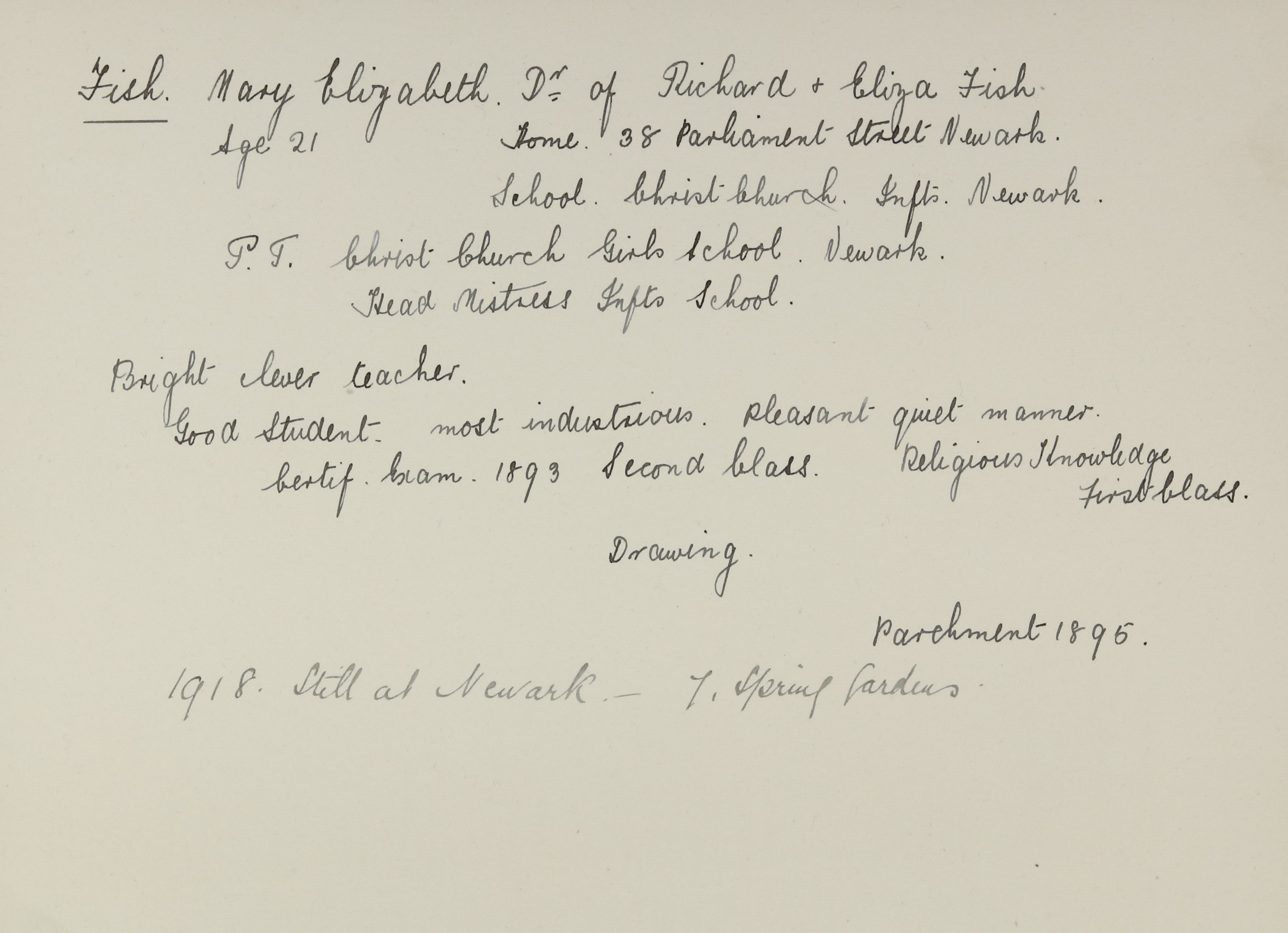 FISH, Mary Elizabeth of 7 Spring Gardens, Newark-on-Trent, Nottinghamshire, spinster died 20 September 1940. Probate Nottingham 27 November to Charles James Else, retired cashier and Lucy Else (wife of the said Charles James Else). Effects £4225, 2s, 2d.