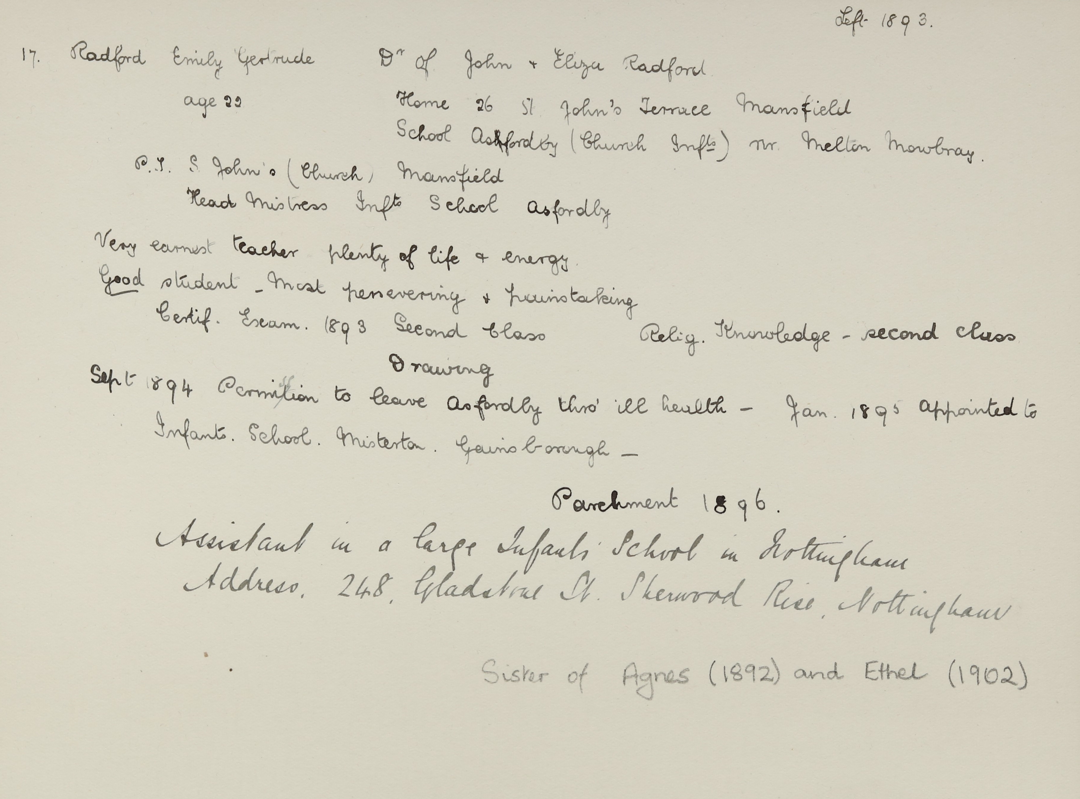 Appointed to Southwark Board School, (Infants,) Nottingham. Head.