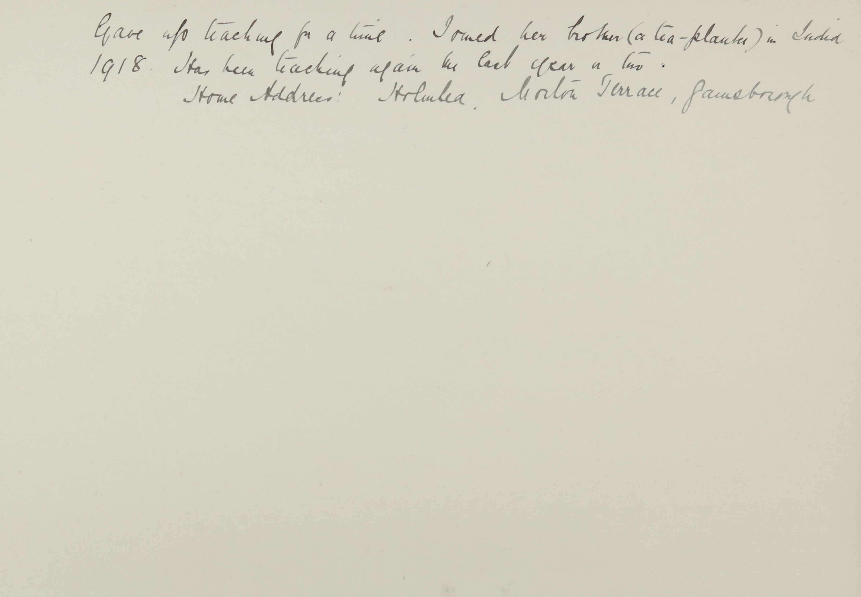 She is at 5 Tennyson Street, Gainsborough. Her mother is listed as widow and ‘Actuary of Savings Bank’. Her sister, Gertrude, is listed as ‘Housekeeper’. Elizabeth is listed as ‘Elementary School Mistress’. Her brother, Edgar, is listed as ‘Organist and Professor of Music’. Her brother, Clement, is listed as ‘Mechanical Engineer’s Clerk’. Her brother, Wilfred, is listed as ‘Apprentice to Timber Merchants’. Her brother, Francis, is unlisted. There is a servant, Mary J Harrison (b. 1883).