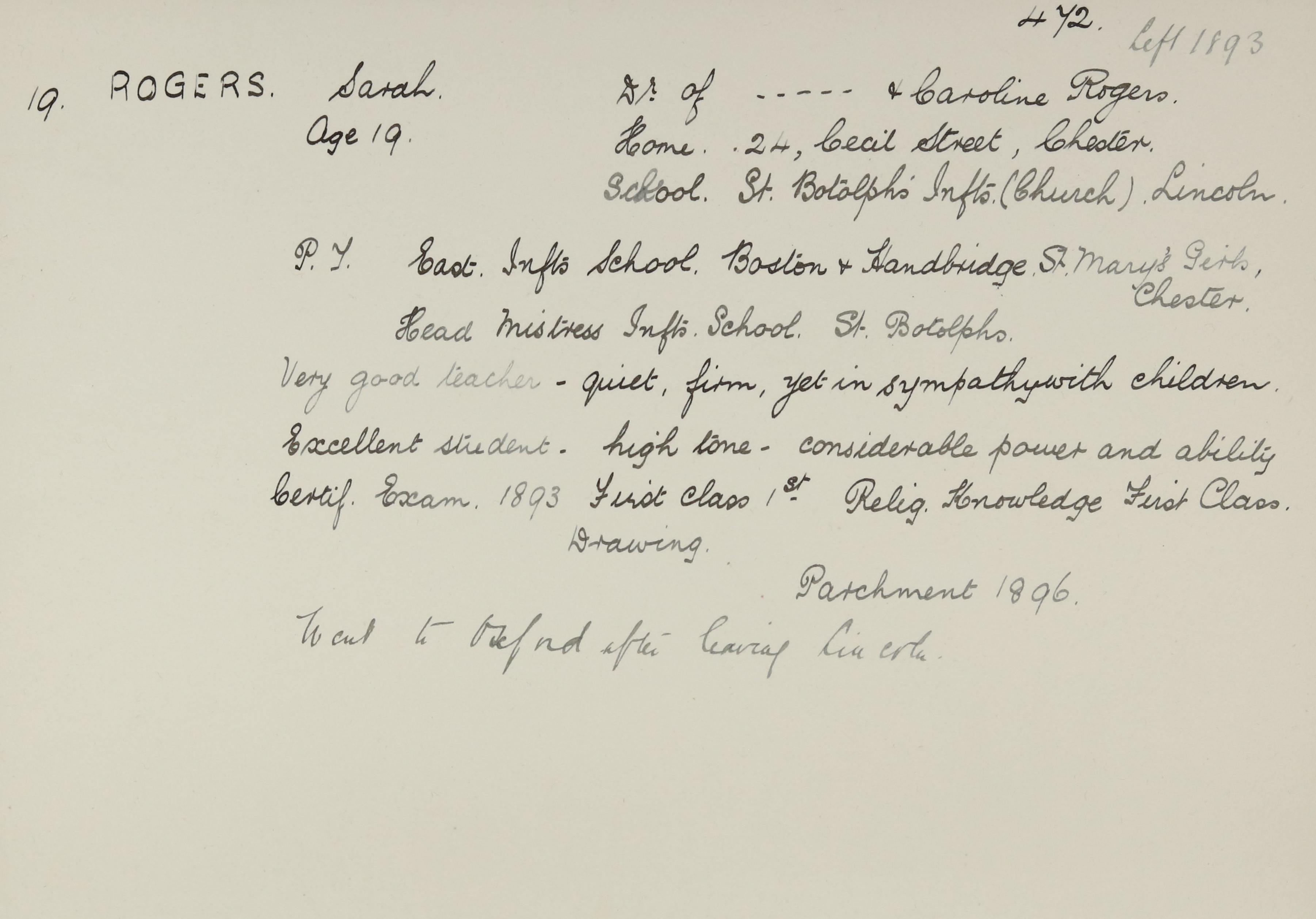 She is at Cecil Street, Chester. Her mother is an unlisted widow. Her brother, John, is listed as ‘Ironmongers Clerk’. Sarah is listed as ‘Pupil Teacher’.
