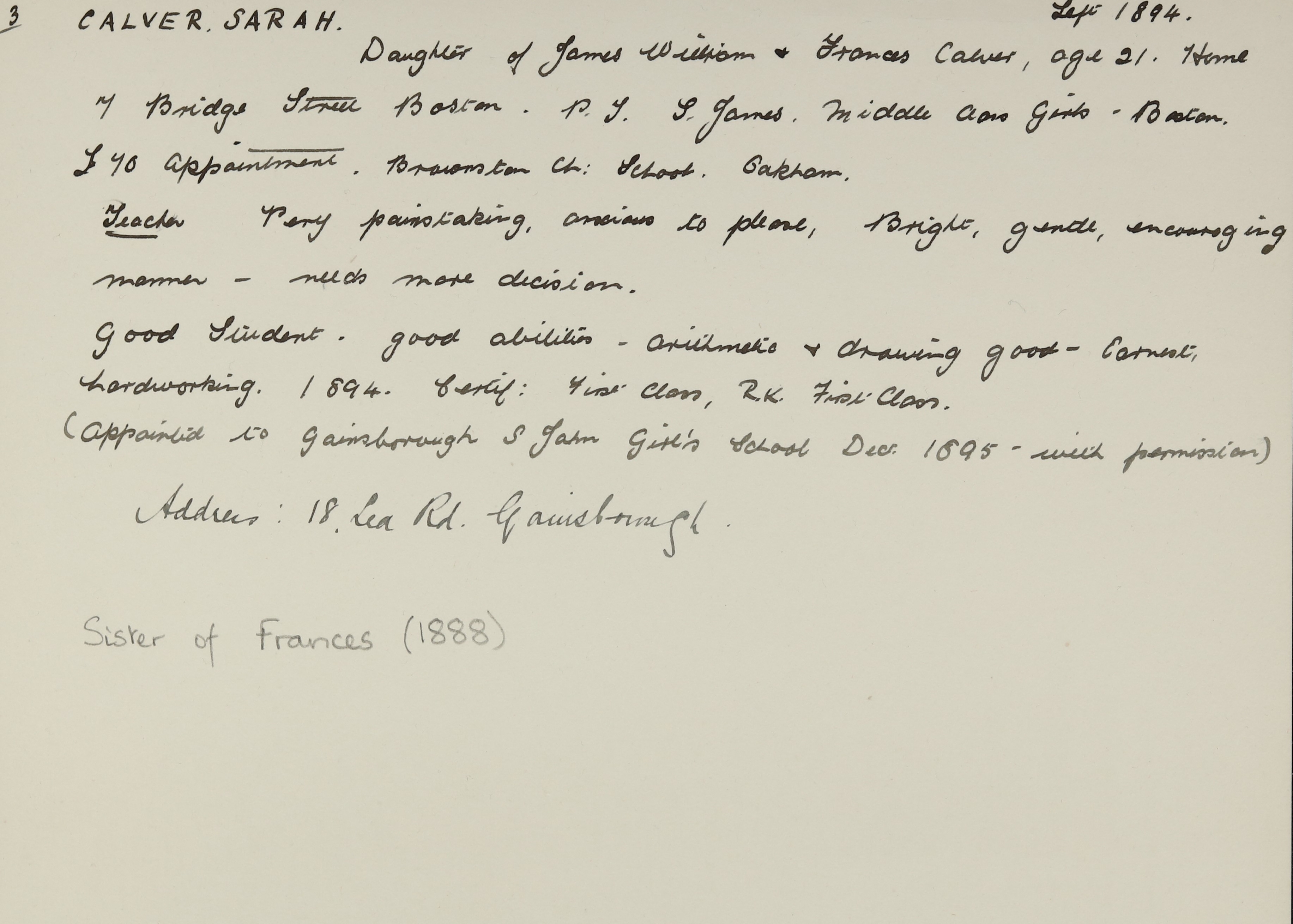 She is 18 Lea Road, Gainsborough. Sarah and her sister, Frances, are listed as ‘Head Mistress Schoolmistress Elementary’. Hettie Malty (b. 1891) is listed as ‘Teacher Elementary’.