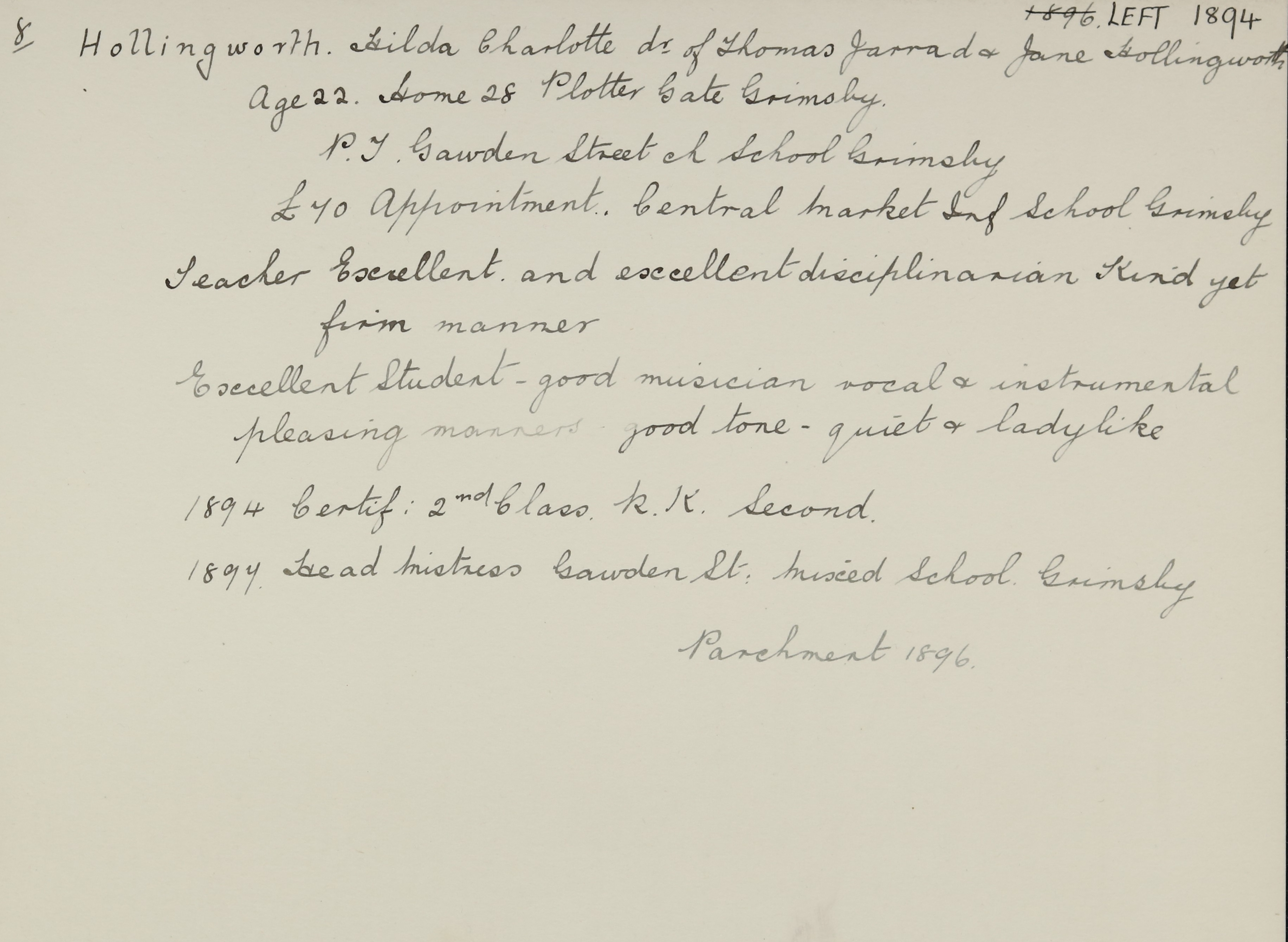 Appointed to Central Market Church School, (Infants,) Grimsby. Salary £70. Assistant.