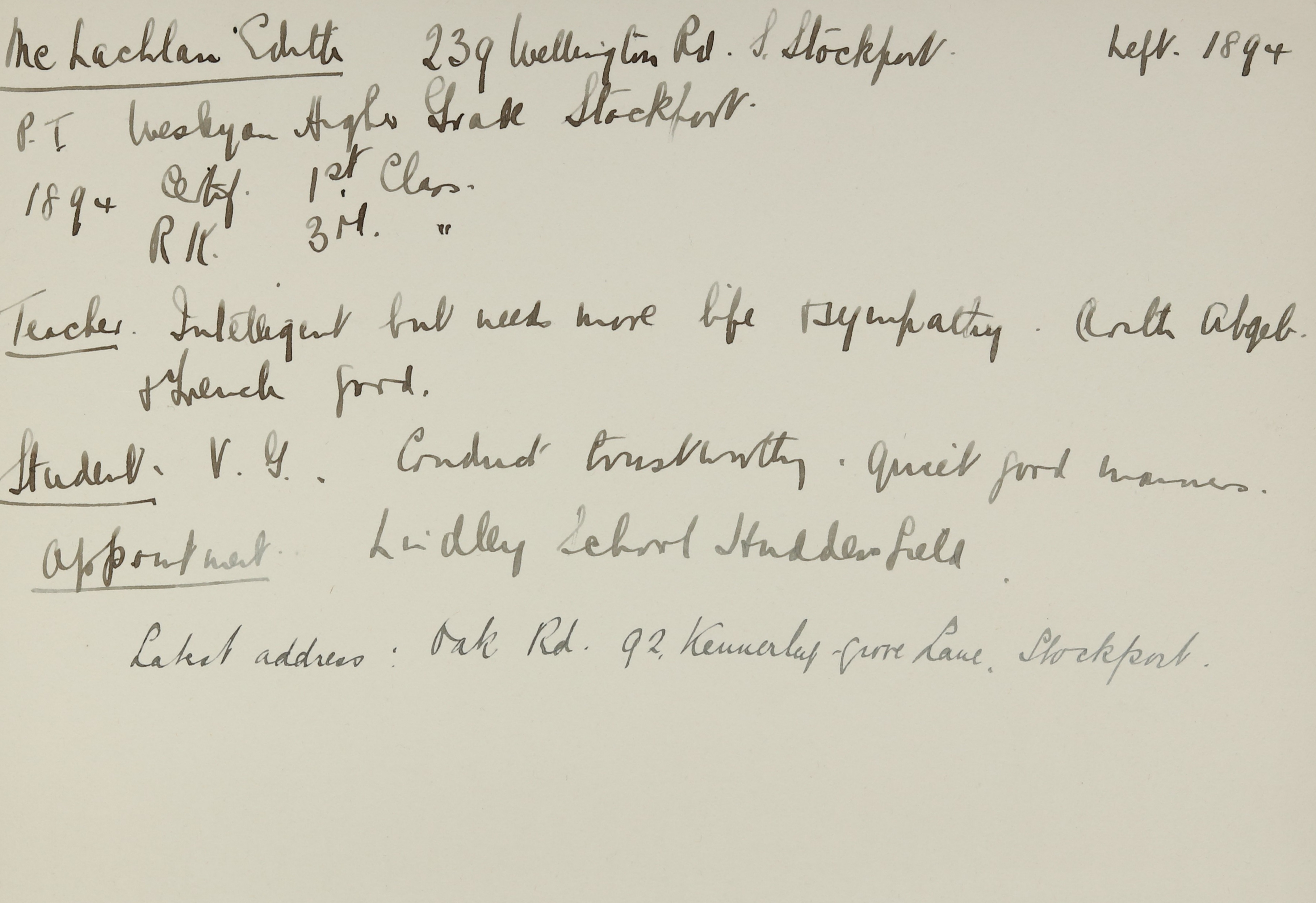 Appointed to Church School, Stockport.
