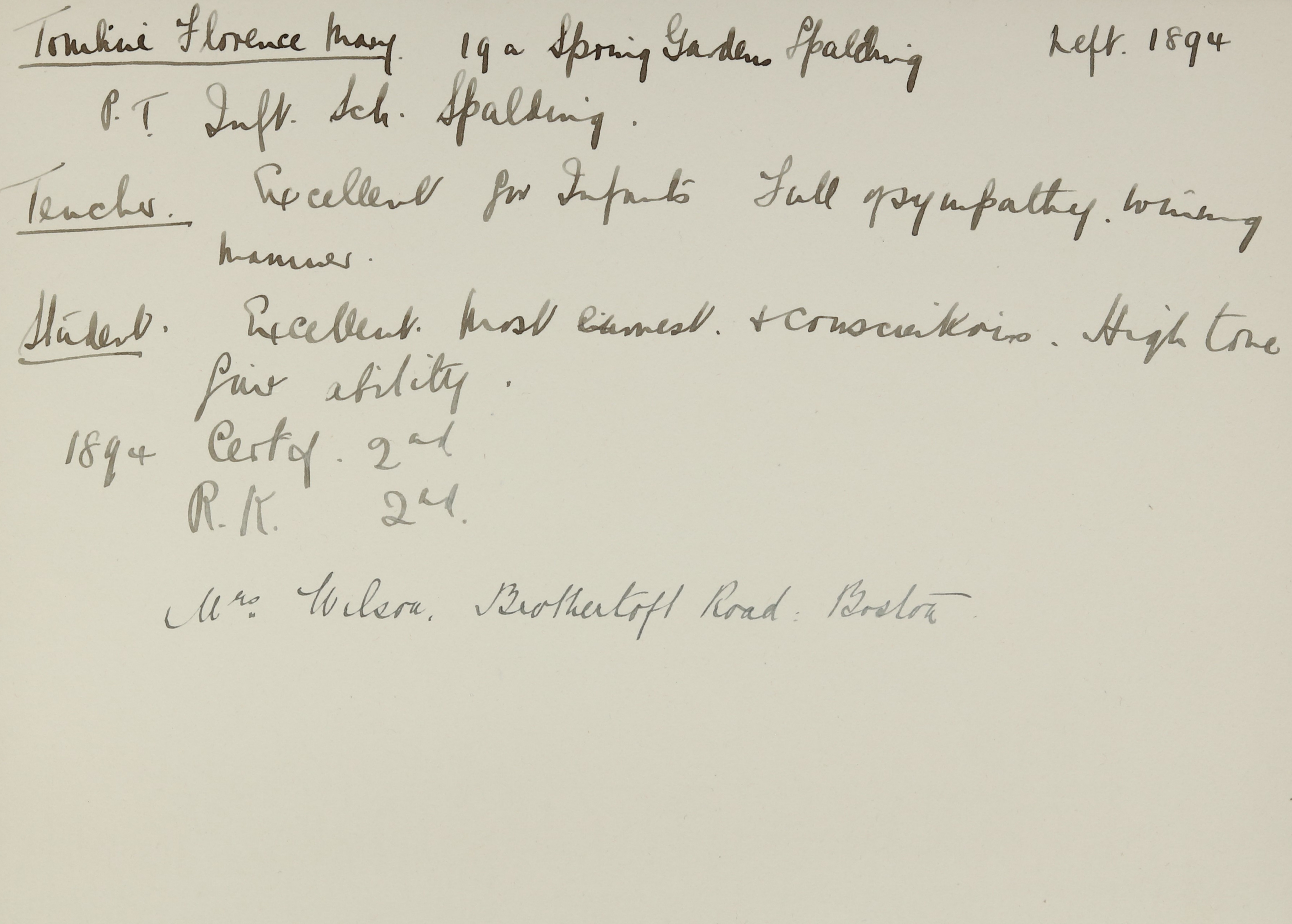 She is at Spring Gardens, Spalding. Her father is listed as widow and ‘Relieving Officer Vaccination Officer and School Attendance Officer’. Florence and her brother, William, are listed as ‘Pupil Teacher’. Her aunt, Mary Ann Miller Tomline (b. 1836), are unlisted. There is a servant, Kate M Mears (b. 1877).