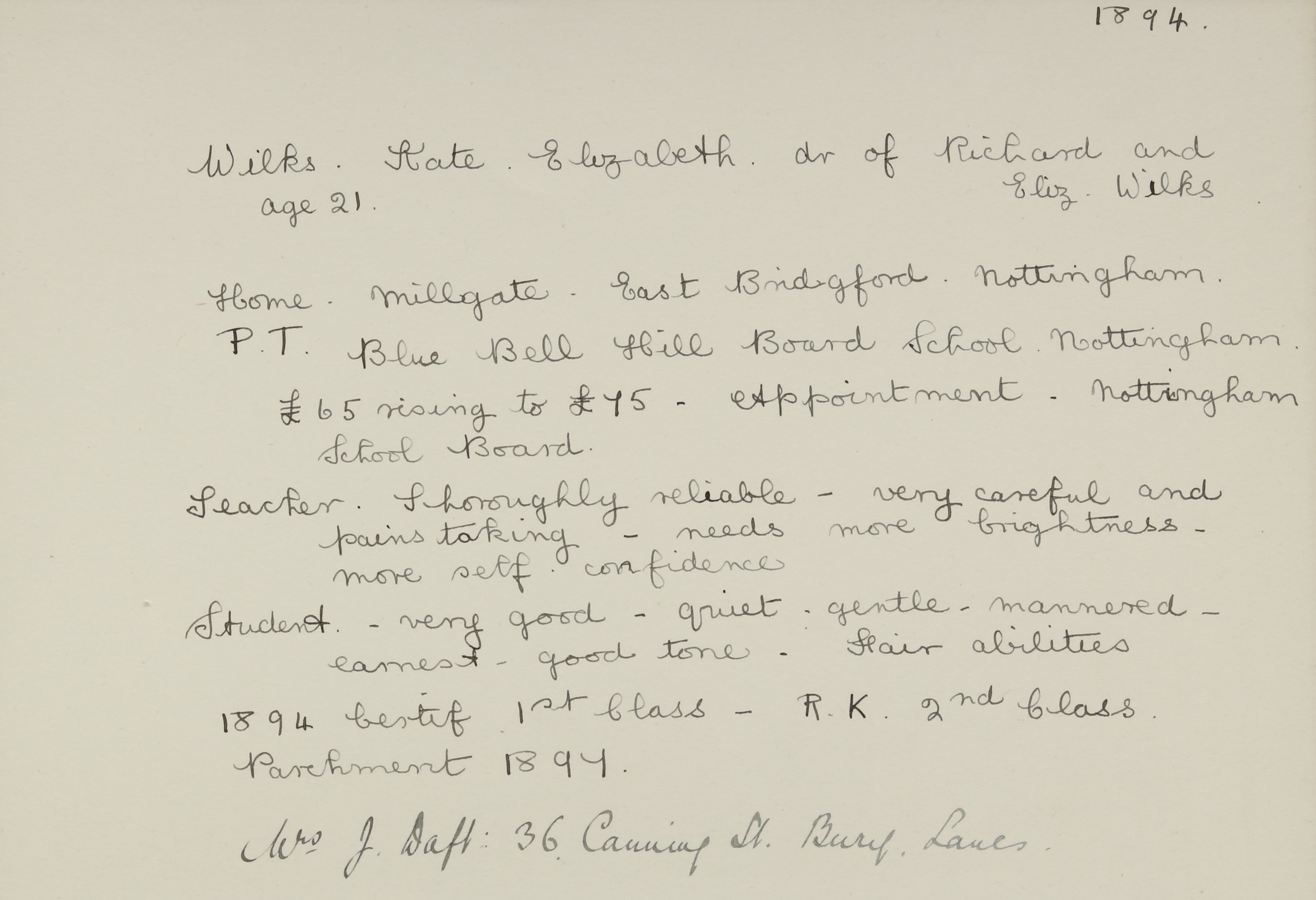 Appointed to Board School, Nottingham. Salary £65 to £75. Assistant.