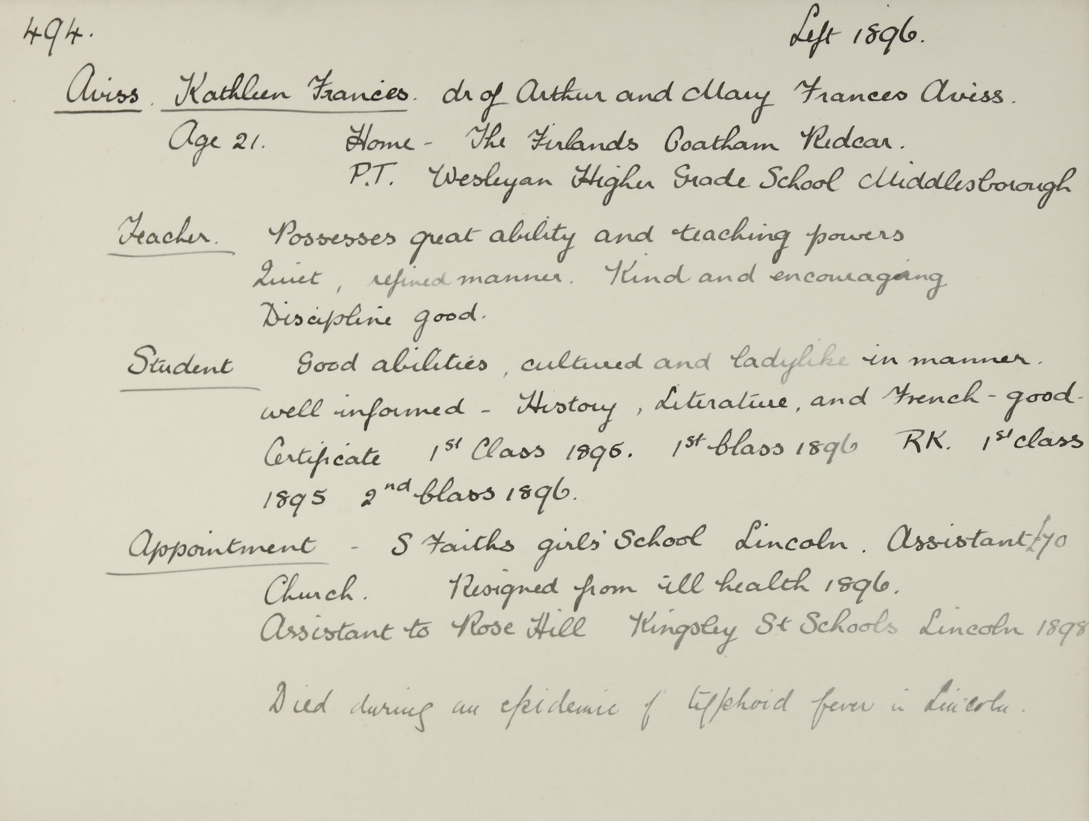 AVISS, Kathleen Frances of Bankhouse Sunderland and of 6 Winnowsty Terrace, Lincoln, spinster died 17 January 1905 at ‘Riverslee’ Lincoln. Probate Durham 21 February to William Roach Thomas, banker’s cashier, Effects £824, 5s, 11d.