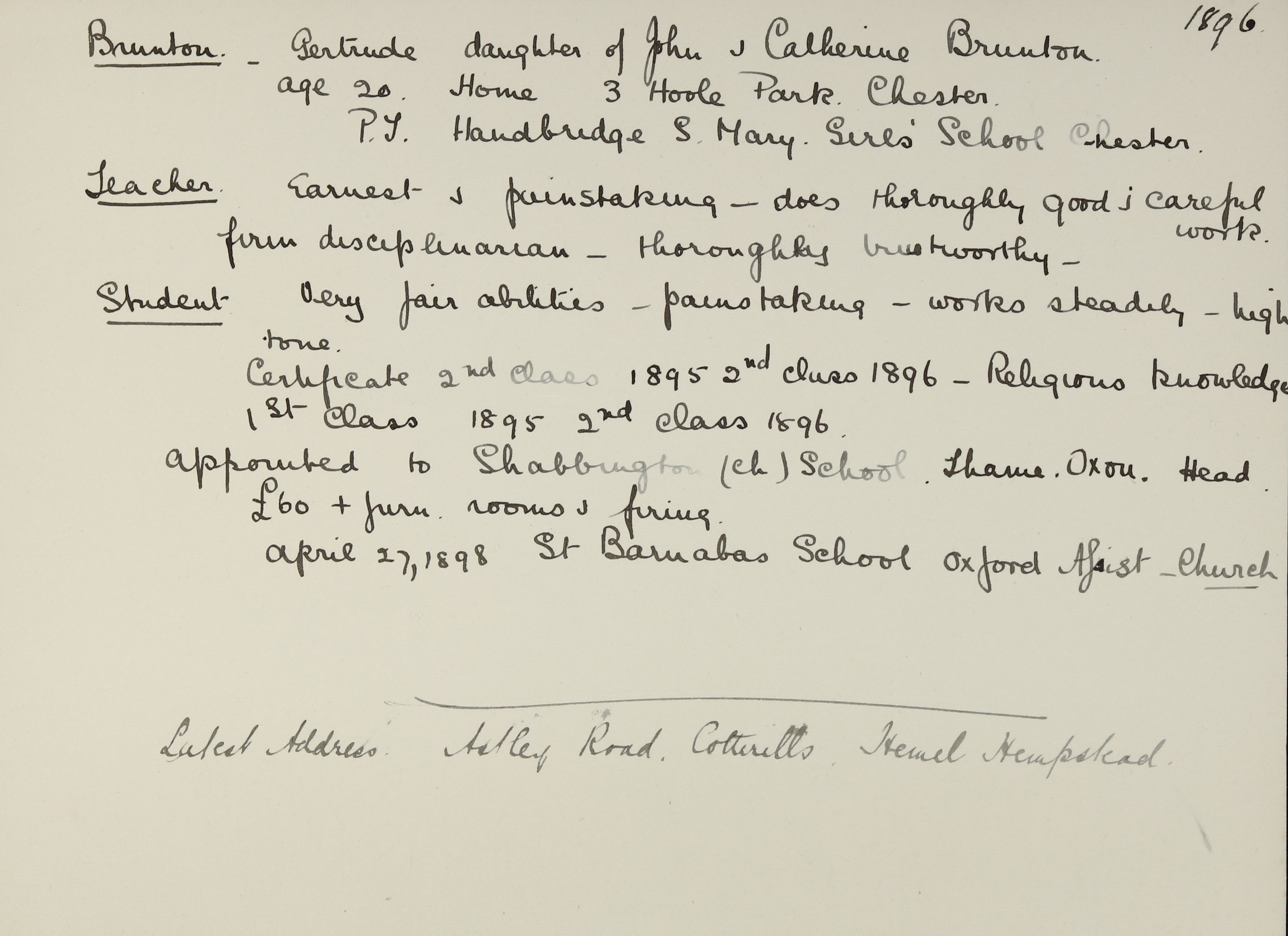 Appointed to Shabbington Church School, Thame, Oxon. Salary £70. Assistant.