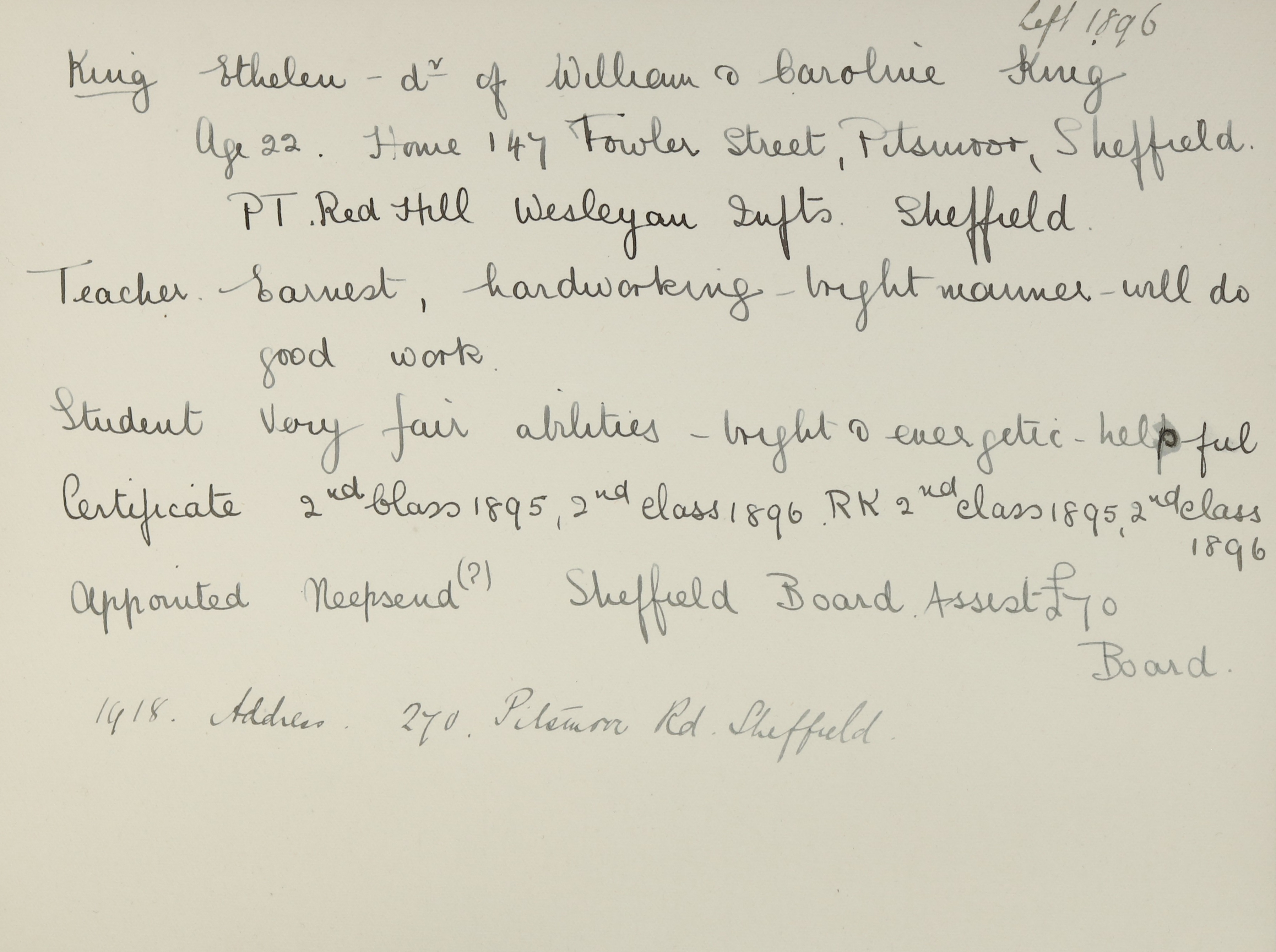 Appointed to Sheffield Board School. Salary £70. Assistant.