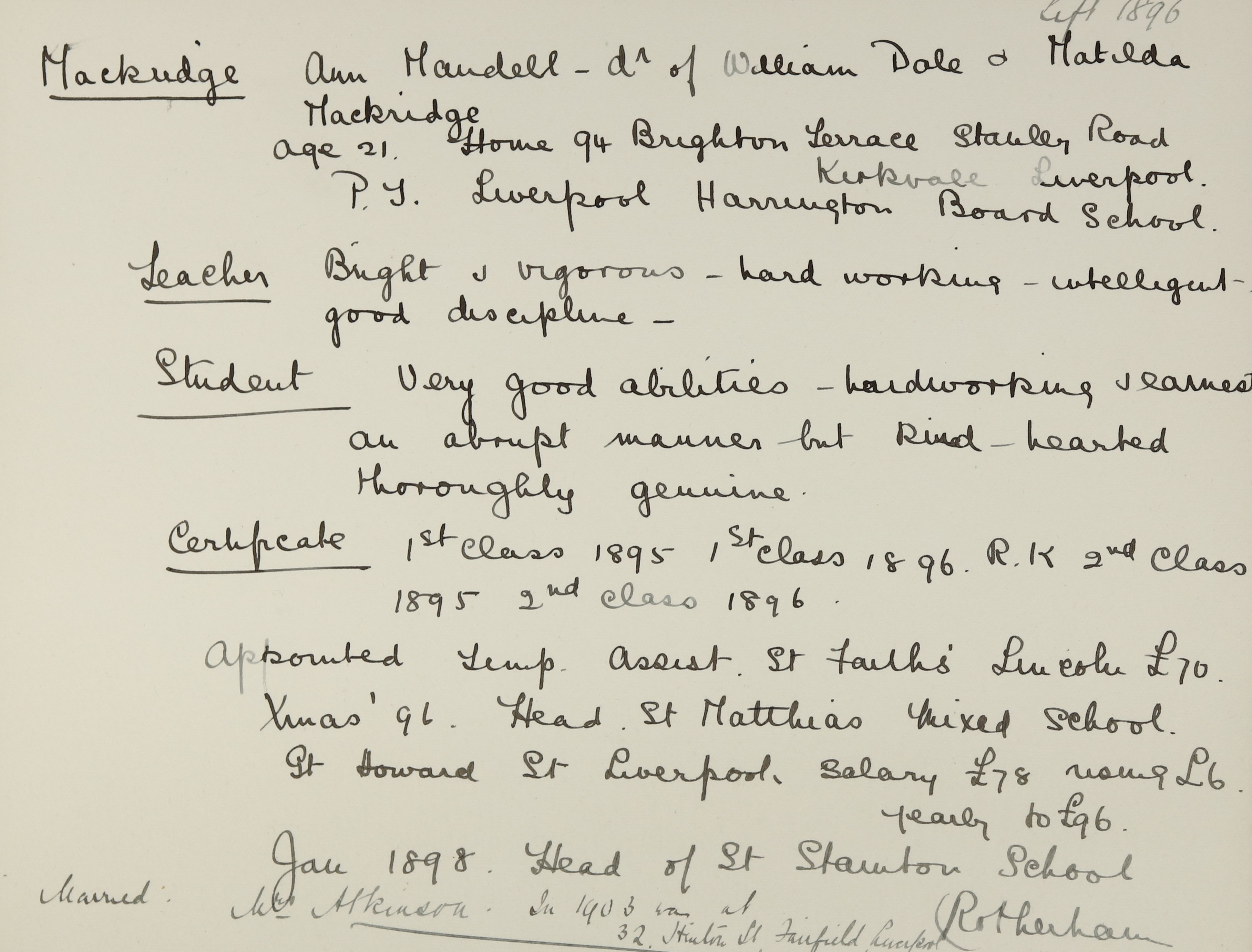 Appointed to S. Matthias' Schools, Great Howard Street, Liverpool. Salary £78. Head.
