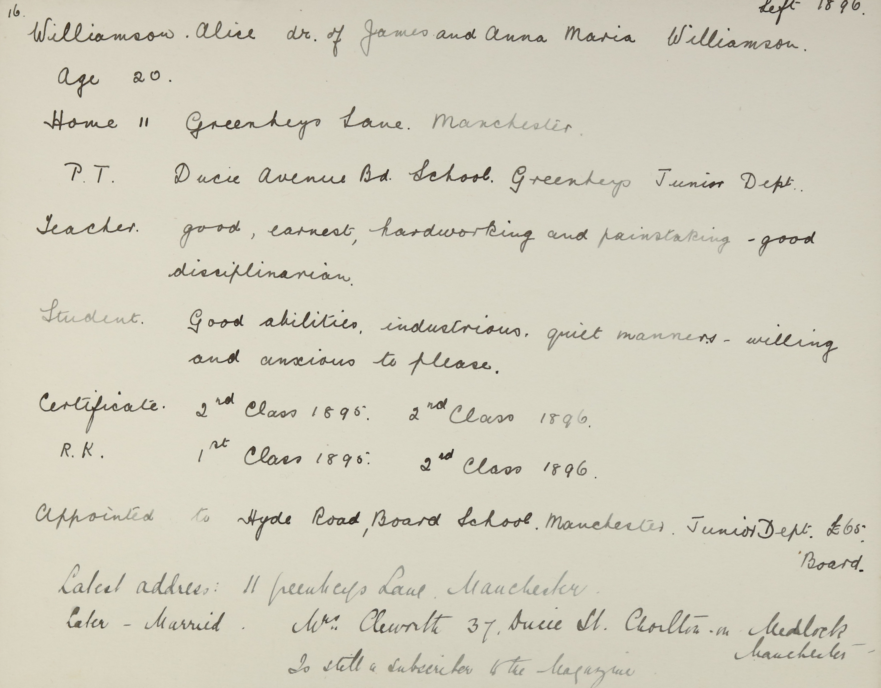 Appointed to Hyde Road Board School, Manchester. Salary £65. Assistant.