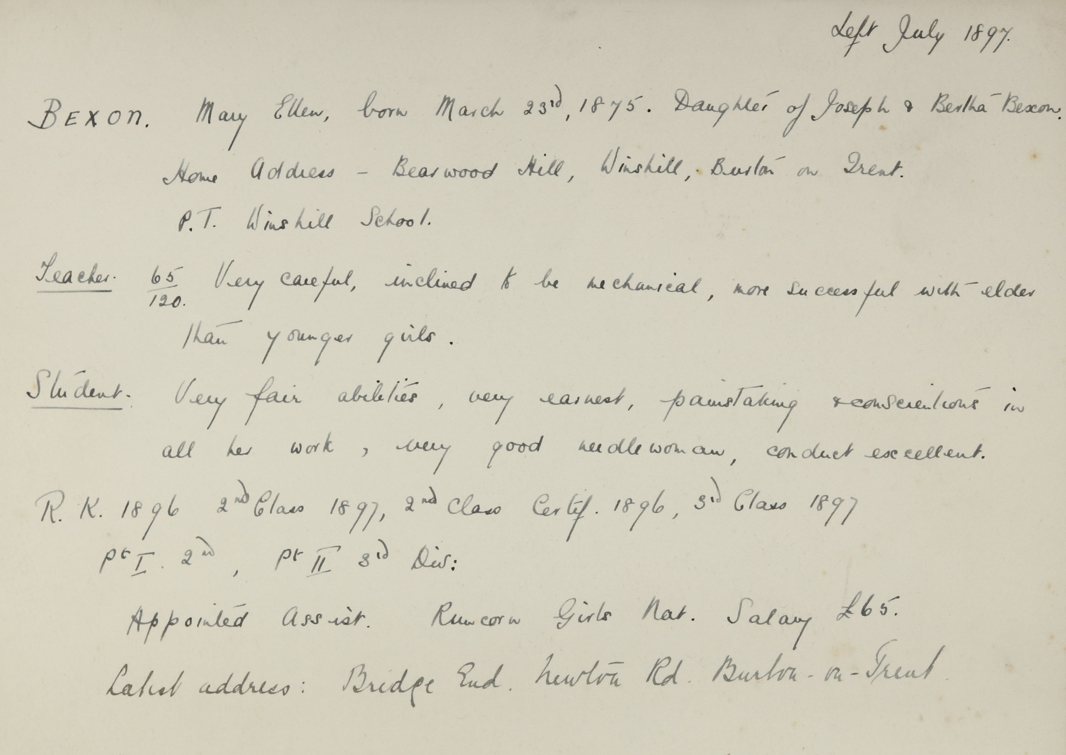 Appointed to National Girls' School, Runcorn. Assistant.
