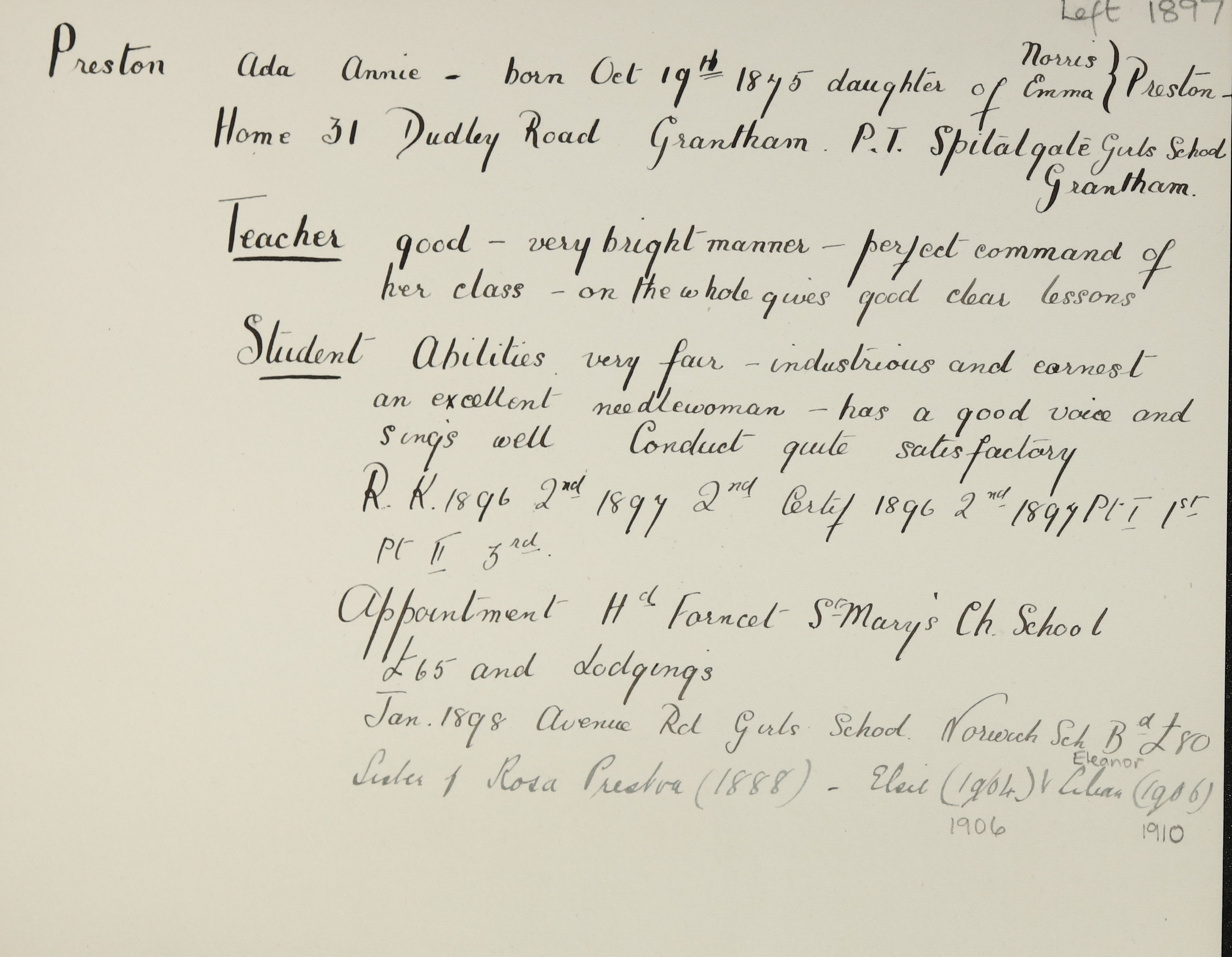 Sisters: Ethel May Preston (b. 1873), Rosa Emma Preston (b. 1868) [LDTC 1888], Florence Alice Preston (b. 1878), Mabel Preston (b. 1880), Marian Speat Preston (b. 1882), Elsie Maud Preston (b. 1884) [LDTC 1906], Olive Lilian Eleanor Preston (b. 1889) [LDTC 1910], Kathleen Kennerley Preston (b. 1891)