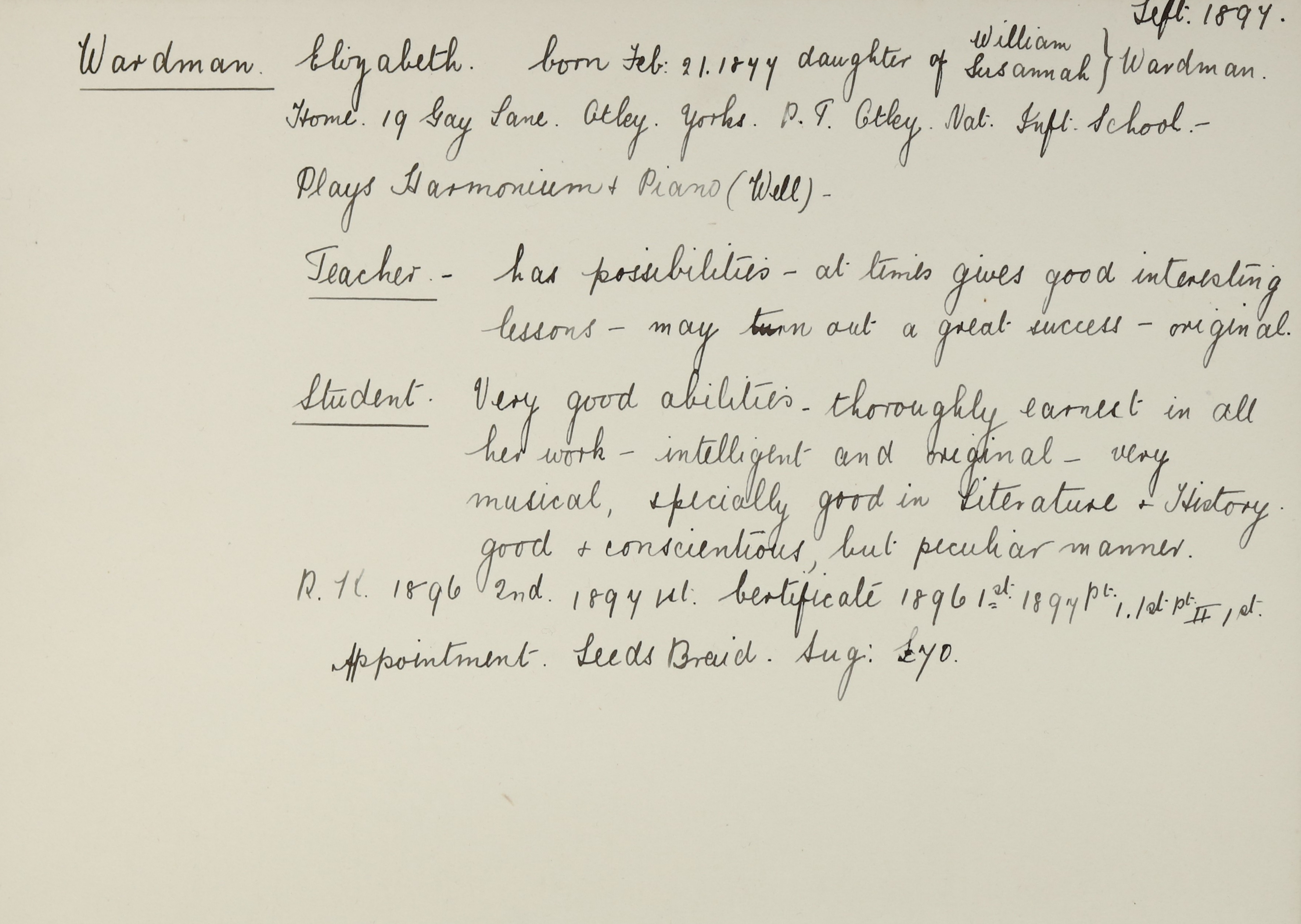 Appointed to Leeds Board School. Salary £70. Assistant.