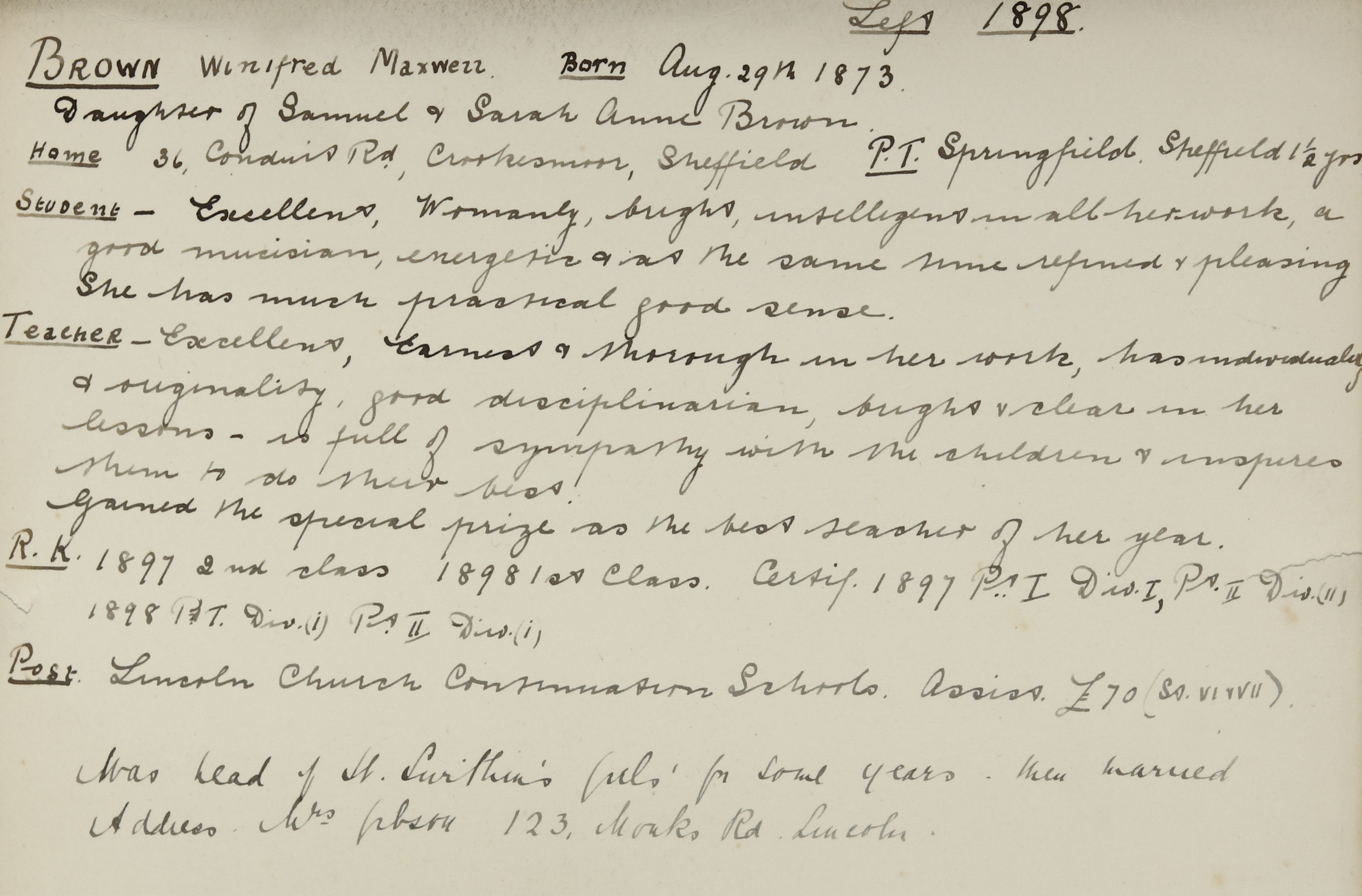 Appointed to Continuation Girls' Church School, Lincoln. Salary £70.