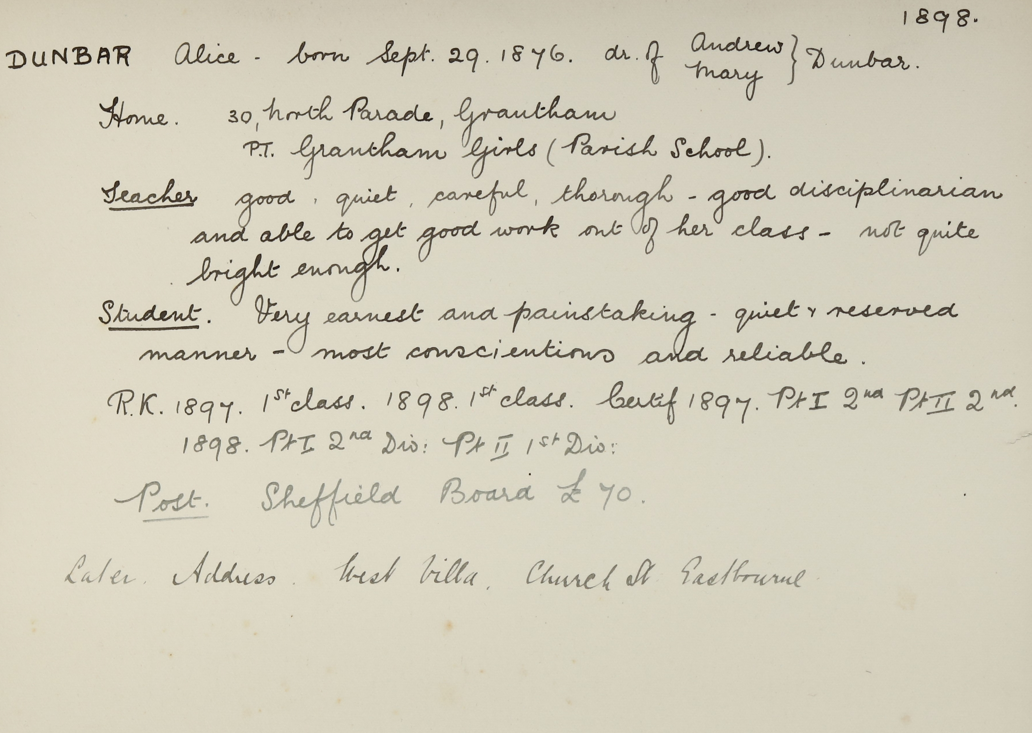 Appointed to Sheffield Board School. Salary £70.