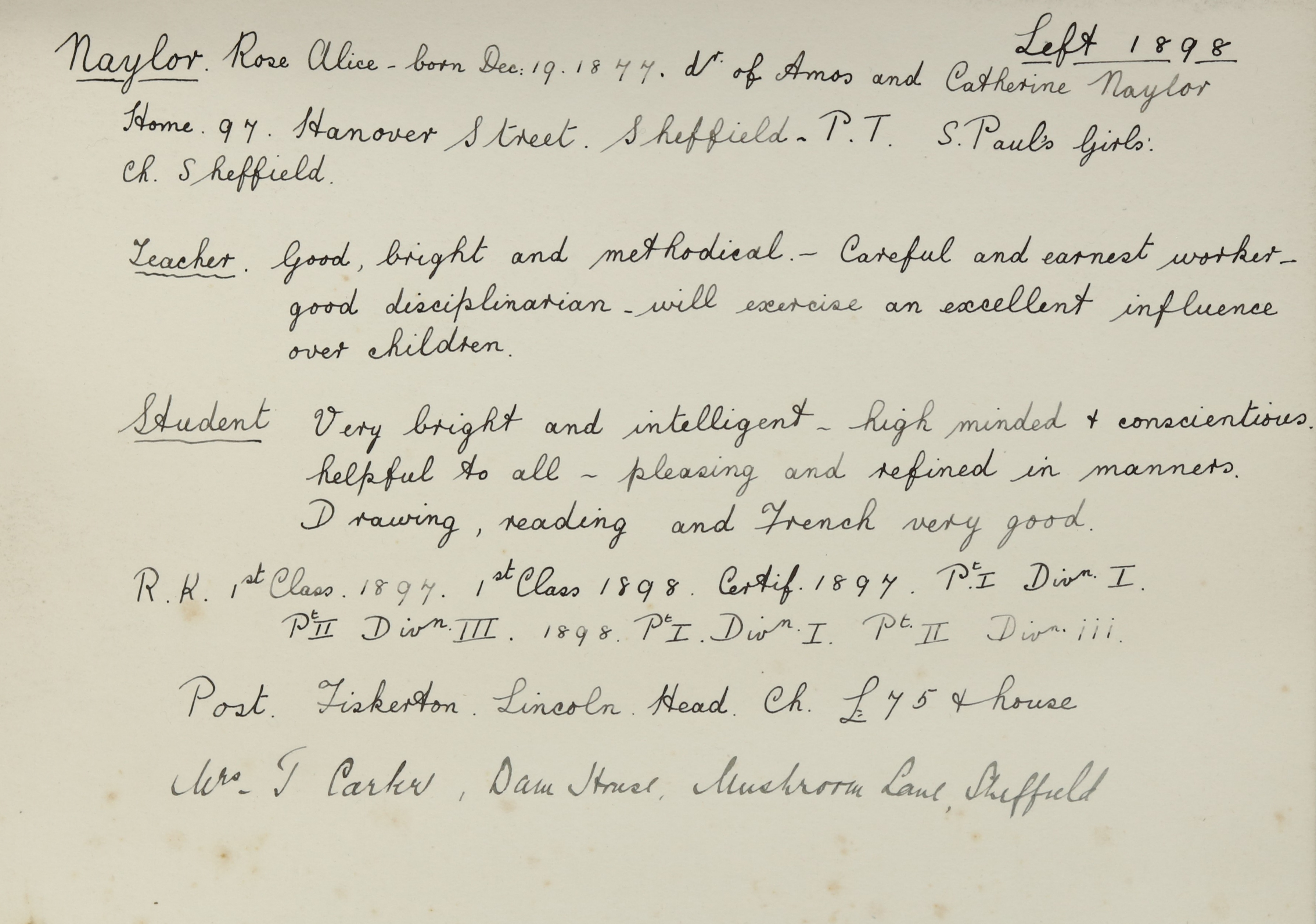 Appointed to Fiskerton Church School, Lincoln. Salary £75.