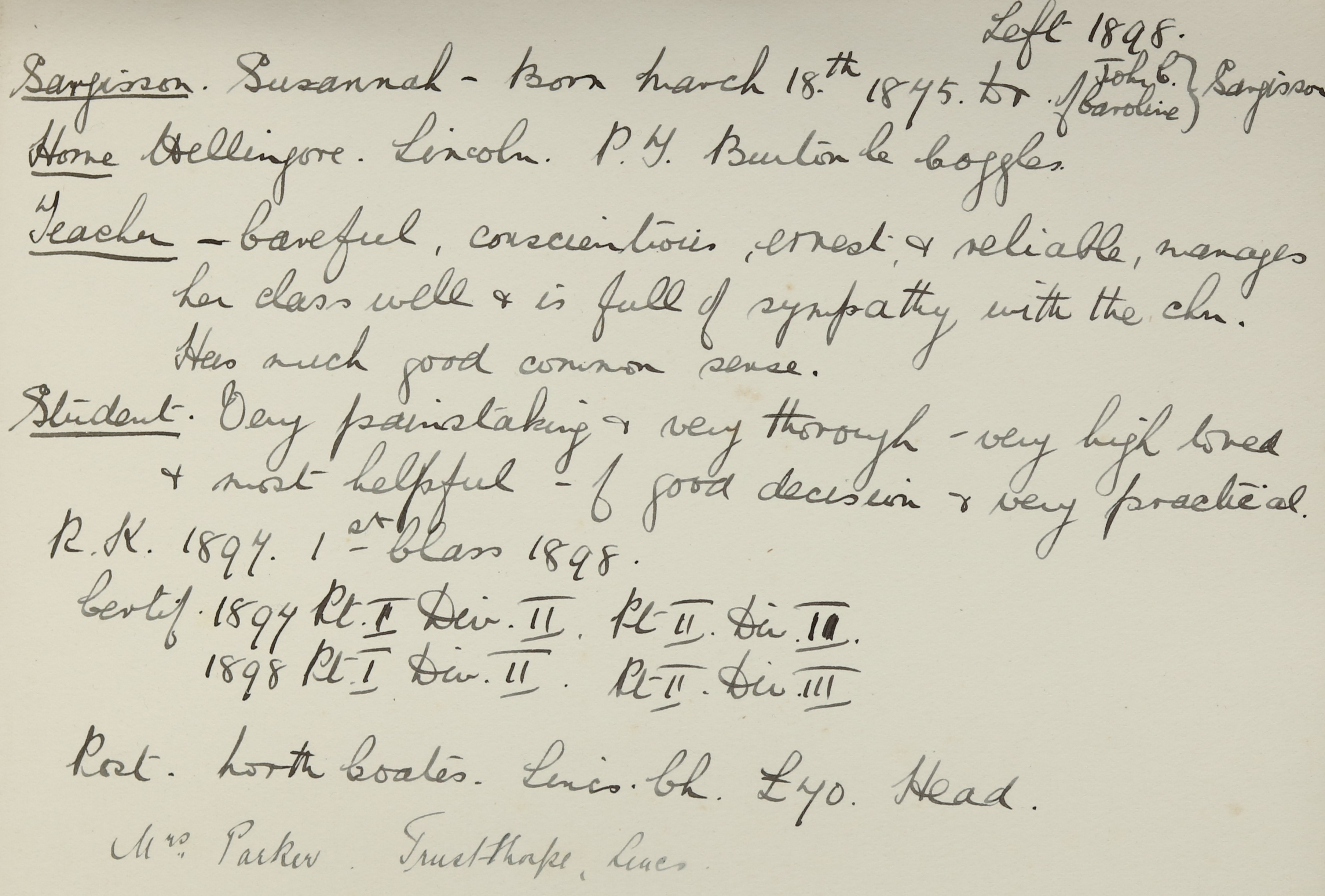 She is at Town Street, Burton Coggles as a boarder. Charlotte Aspenall (b. 1860) is listed as ‘School Mistress Elementary’. Susannah is listed as ‘Pupil Teacher’.