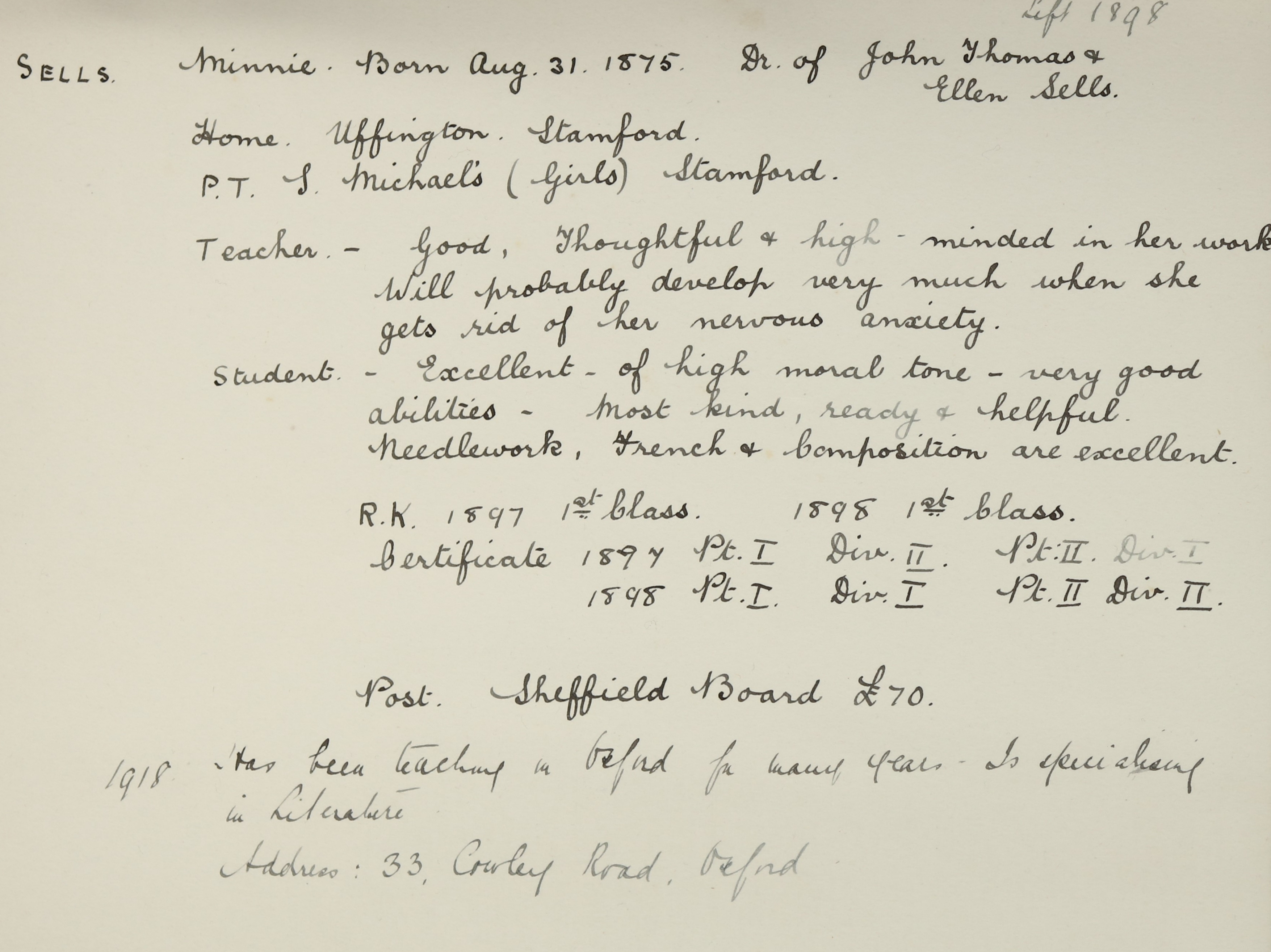 She is at 47 Warwick Street, Oxford as a boarder. The head of the house is John Wright (b. 1851), a ‘Police Pensioner’. His wife, Alice J Wright (b. 1851), is unlisted. Eleanor B Burnett (b. 1876), a boarder, is listed as ‘Trained School Teacher’. Violet A Gibson (b. 1880), a boarder, is listed as ‘Trained School Teacher’. Minnie is listed as ‘Trained School Teacher’.