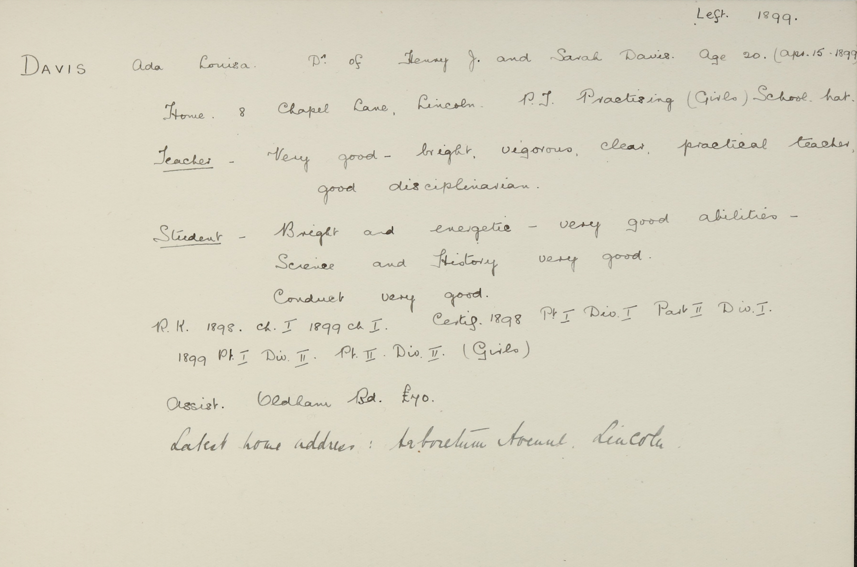 She is at West Bright Row, Lincoln. Her father is listed as ‘Stone Mason’. Ada, her mother and her siblings (Laura, William, Frank and Rose) are unlisted.