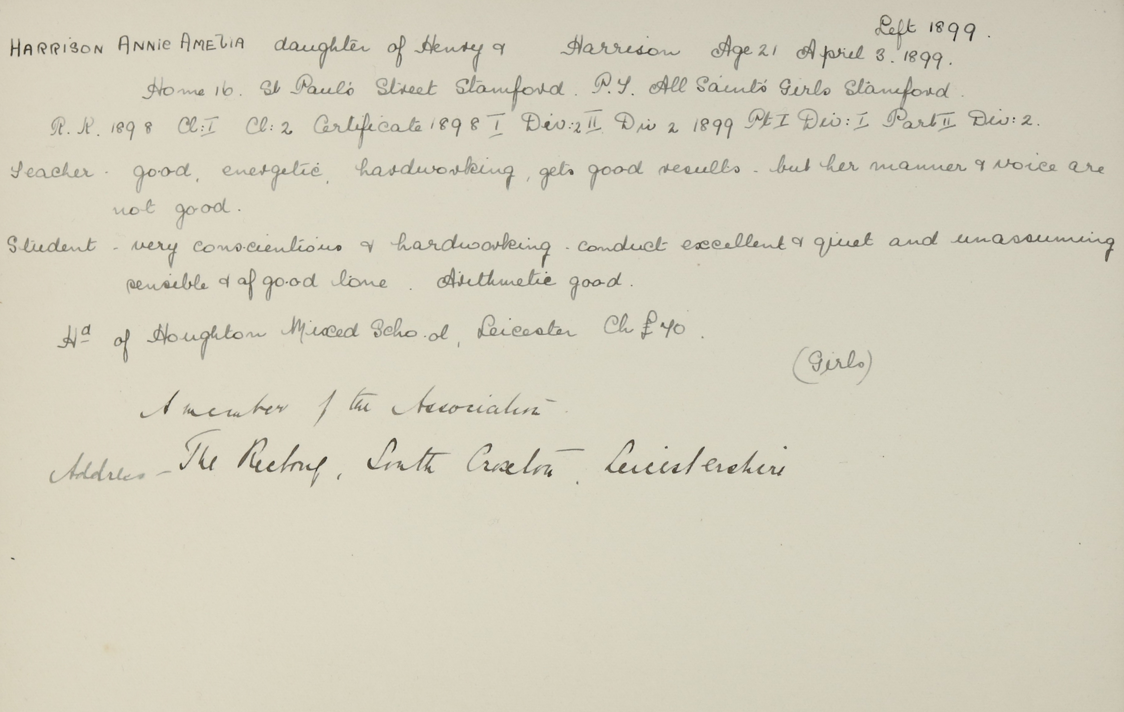 Appointed to Houghton Church School, Leicester. Salary £70.