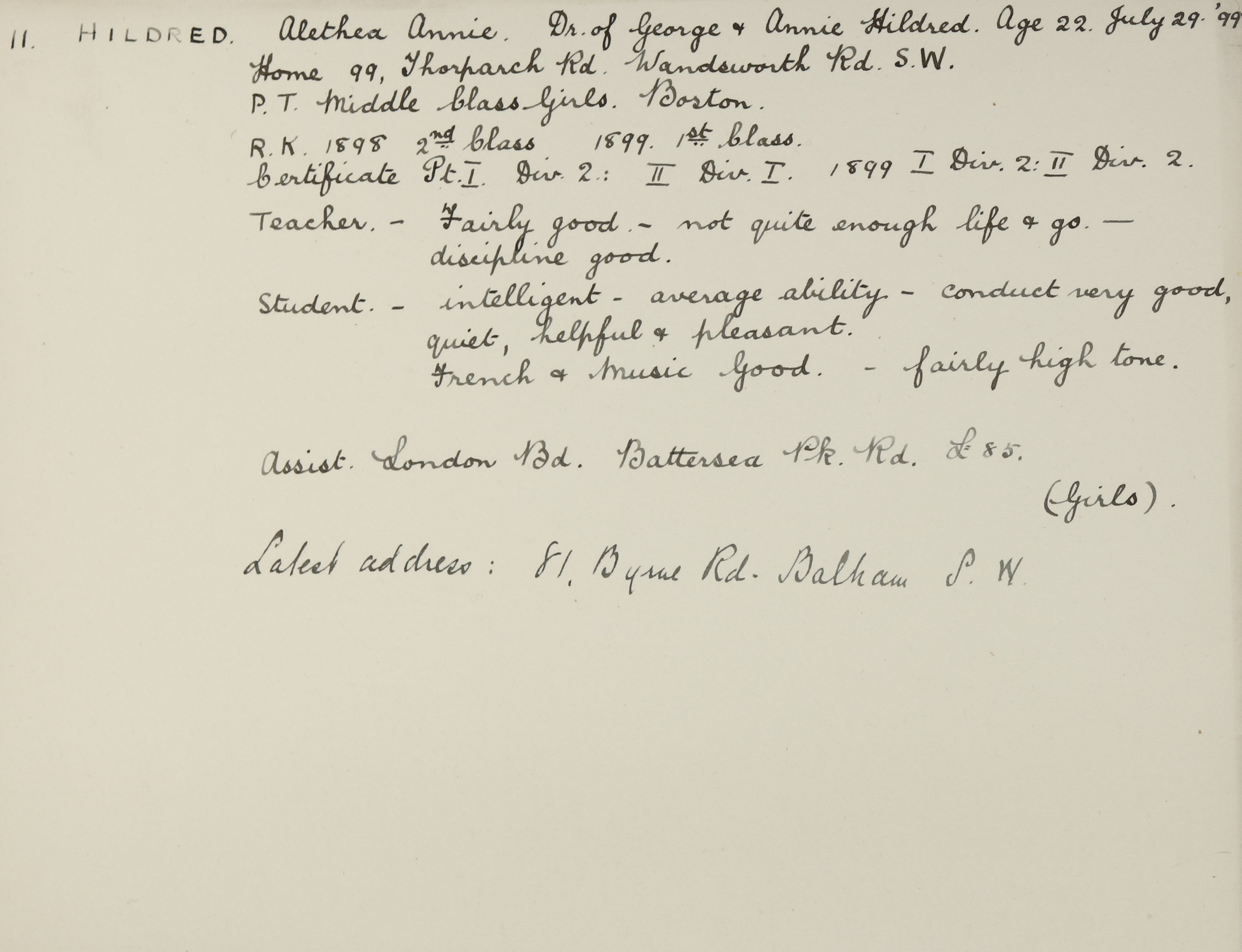 She is at 81 Byrne Road, Balham, London. Her mother is unlisted. Samuel Wallace Dustow (b. 1871), a boarder, is listed as ‘Carpet Planner’. Alethea is listed as ‘Assistant Teacher’.