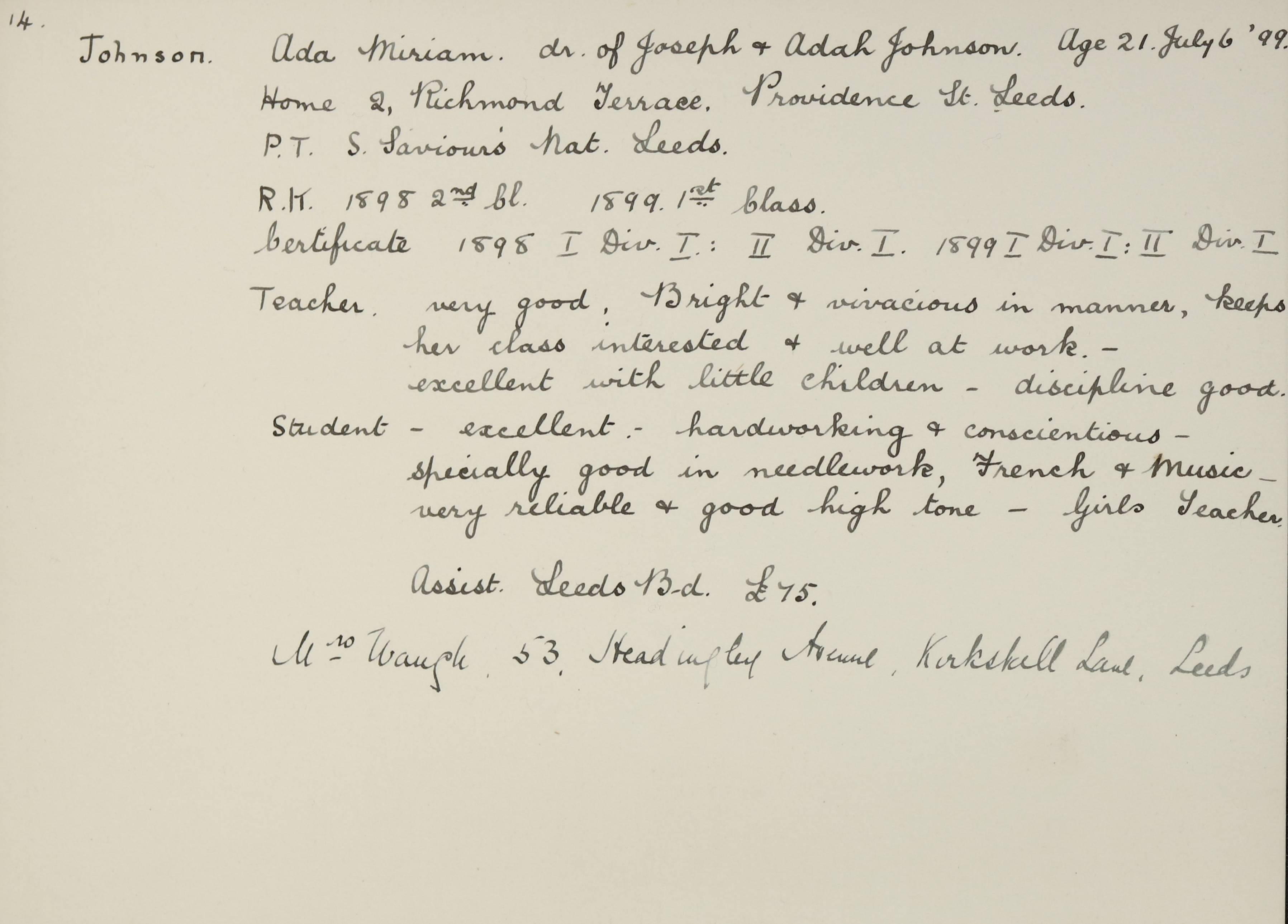 She is at 2 Richmond Terrace, Leeds. Her father is listed as ‘Engine Tenter (Saw Mill)’. Her mother is unlisted. Her brother, Arthur, is listed as ‘Drayman G N Rly’. Ada and her sister, Jessie, are listed as ‘School Teacher’. Her uncle, George Johnson (b. 1862), is listed as ‘Fruit Salesman’.