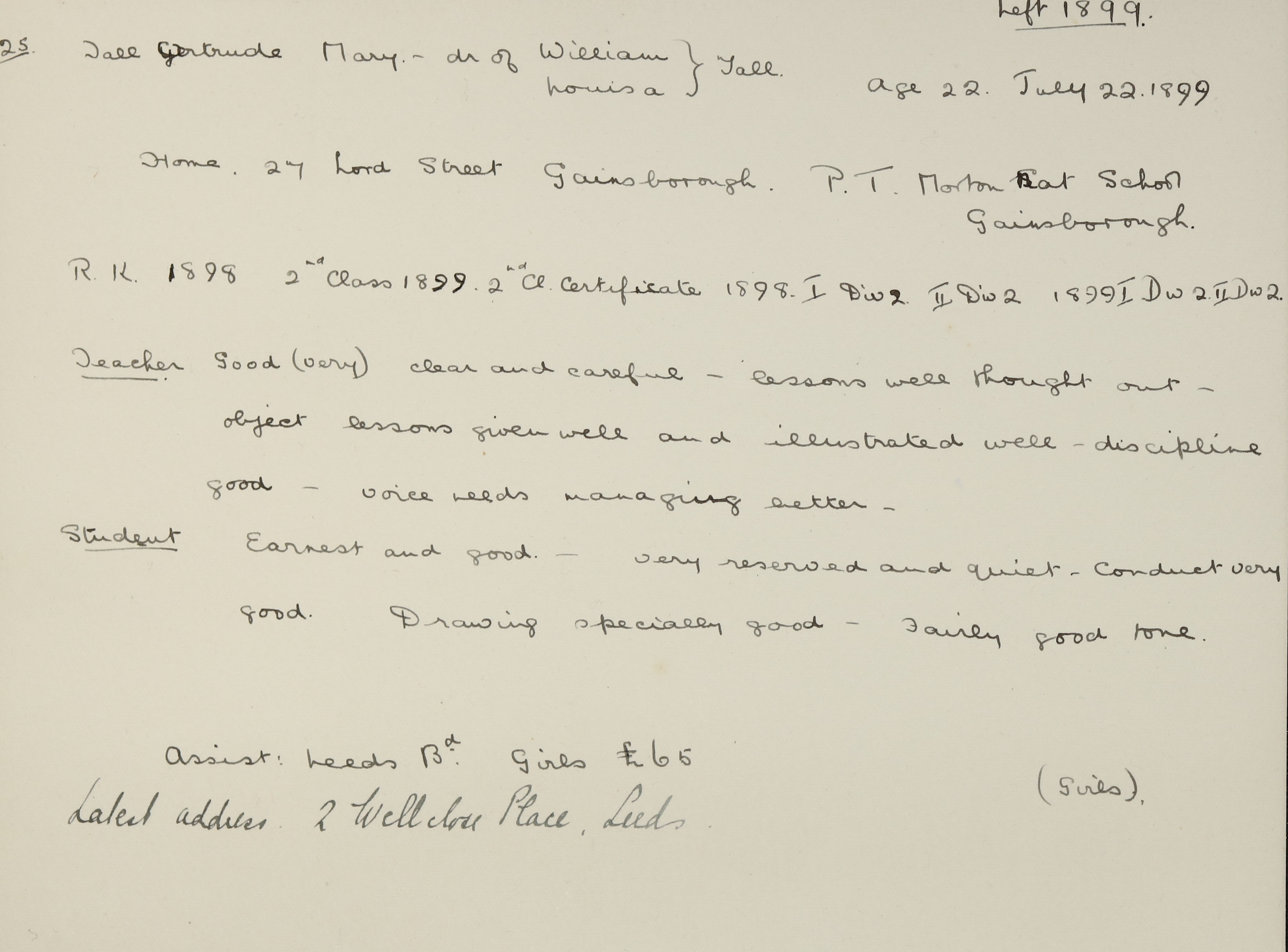 Appointed to Leeds Board School. Salary £65.