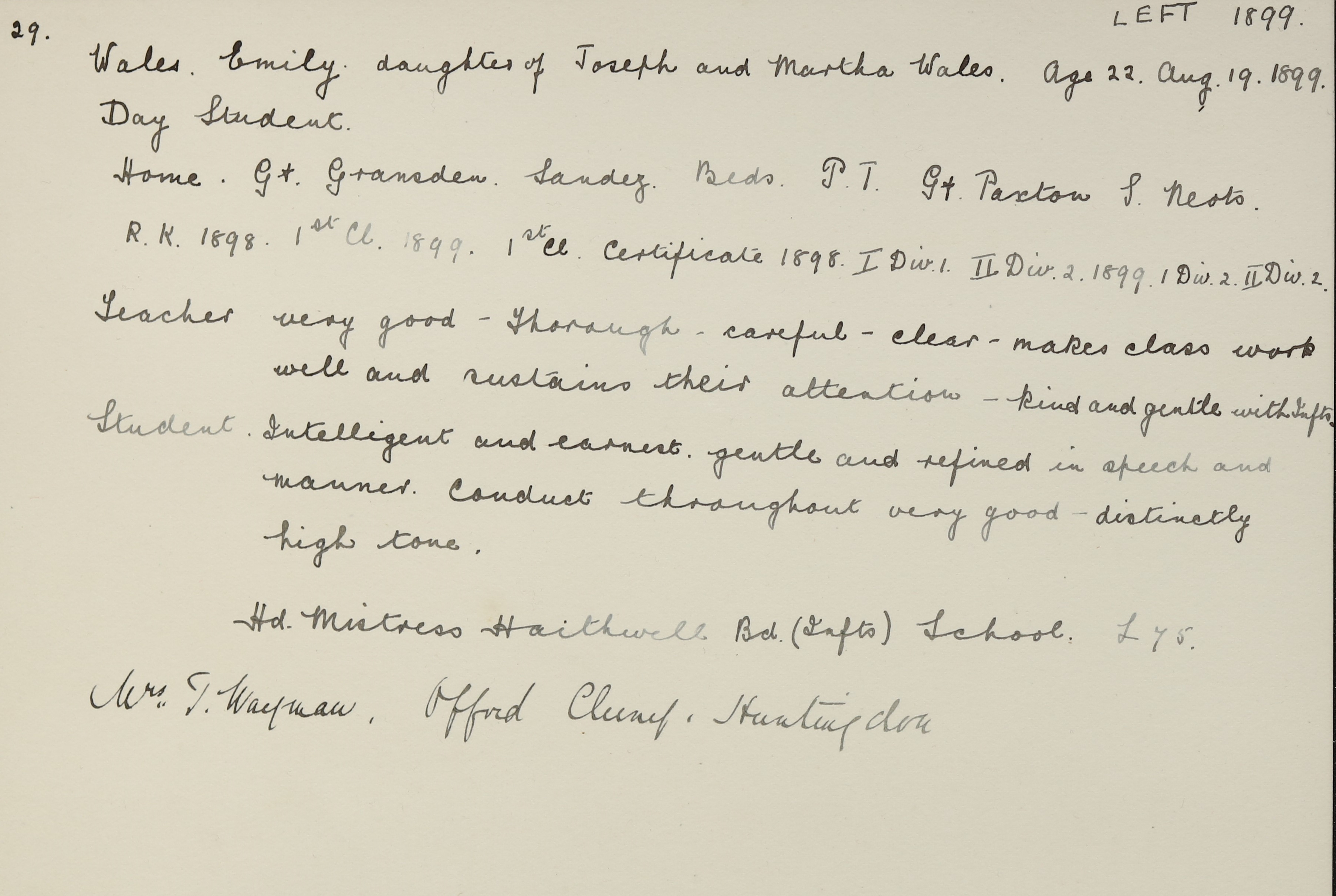 She is at The Square, Waresley, St. Neots. Her father is listed as ‘Police Constable’. Emily, her mother and her siblings (Thomas and Bethiah) are unlisted.