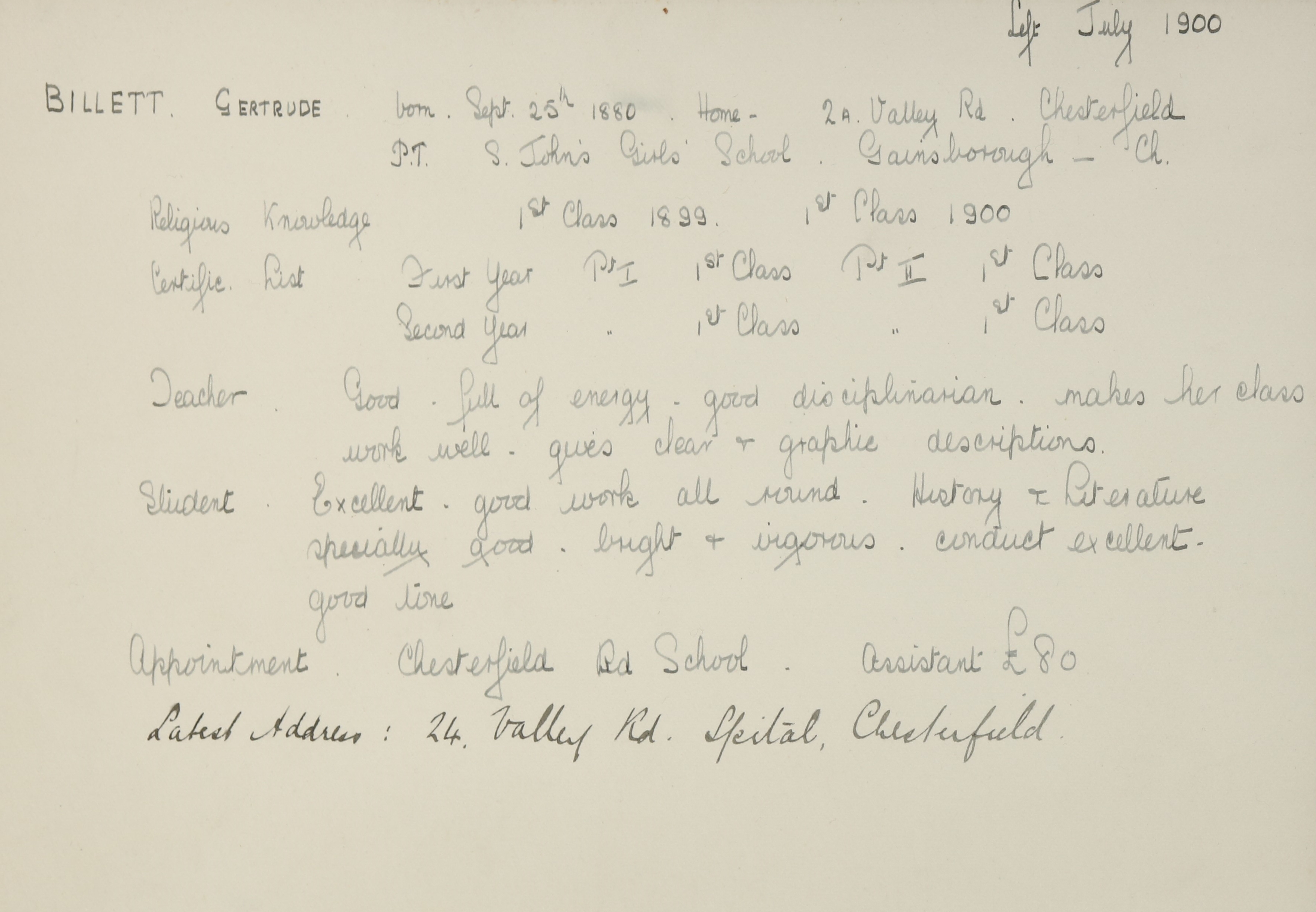 She is at 24 Valley Road, Chesterfield. Her father is listed as ‘Engine Fitter and Erector’. Gertrude is listed as ‘Board School Teacher’. Her brother, Frederick, is listed as ‘Railway Clerk’. Her sister, Bertha, is listed as ‘Dressmaker’. Her mother and siblings (Tom and Dorothy) are unlisted.