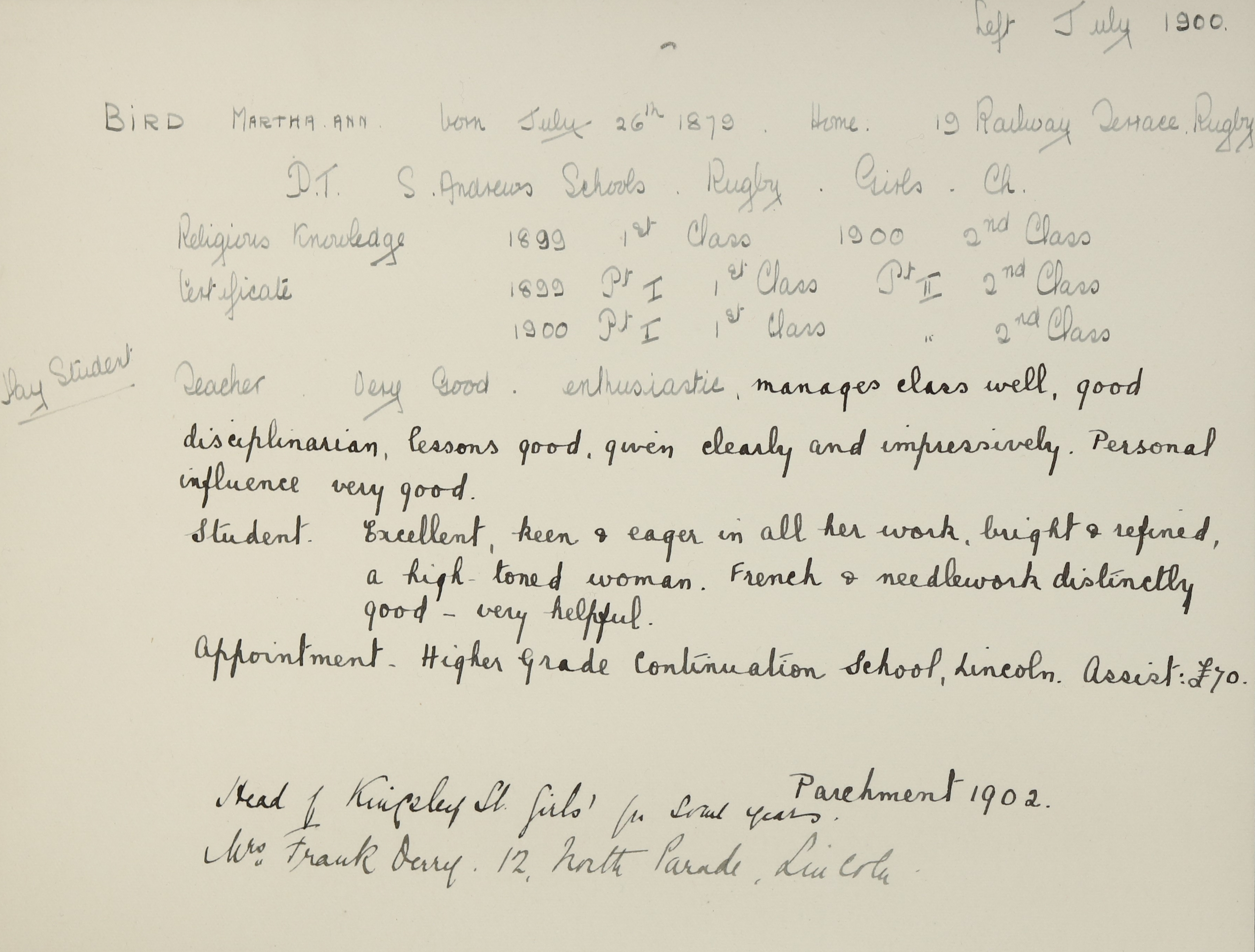 Appointed to Higher Grade Continuation School, Lincoln Church House, Assistant.